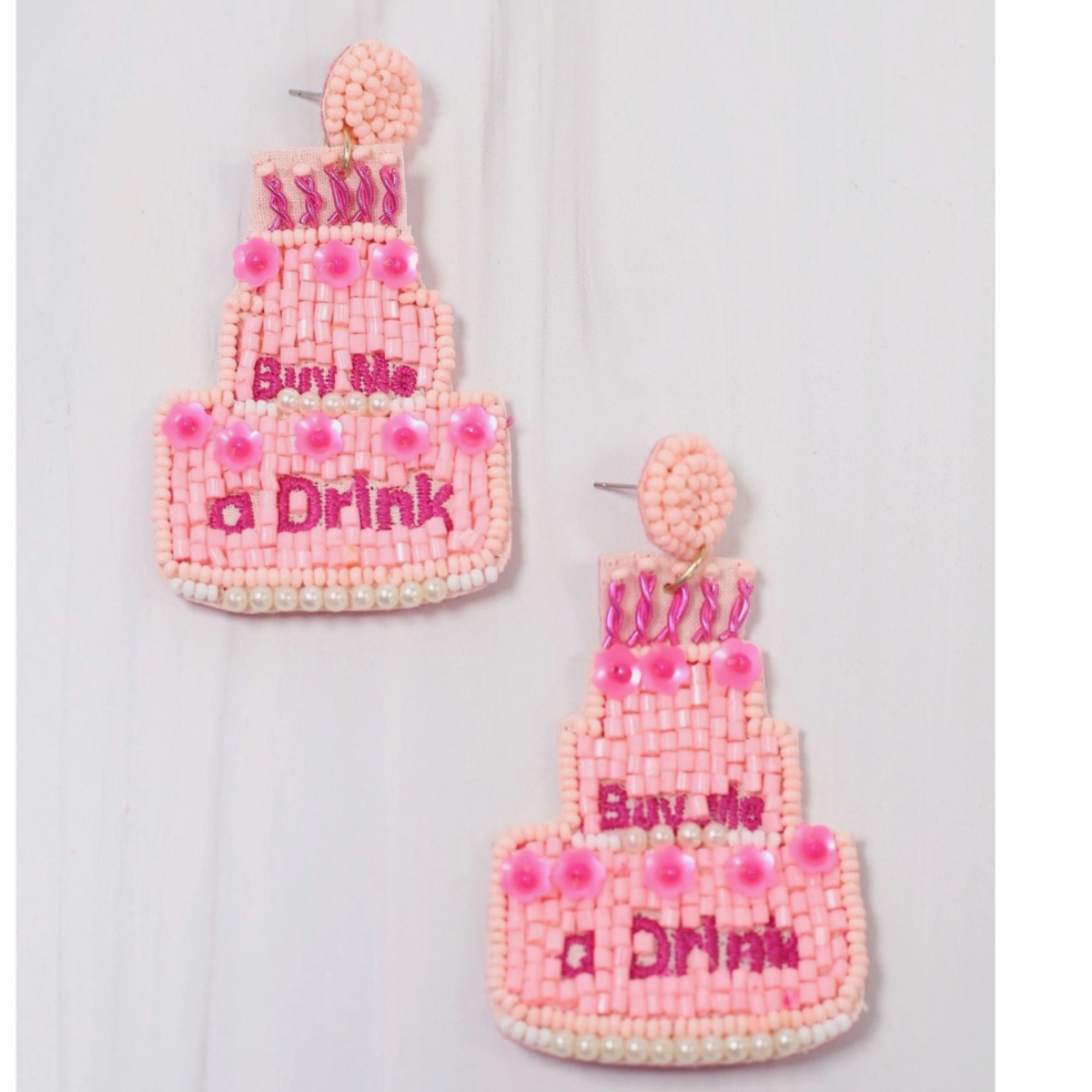 - Features pink beading, pearl accents, sequin flowers, and embroidery that reads "Buy Me a Drink"