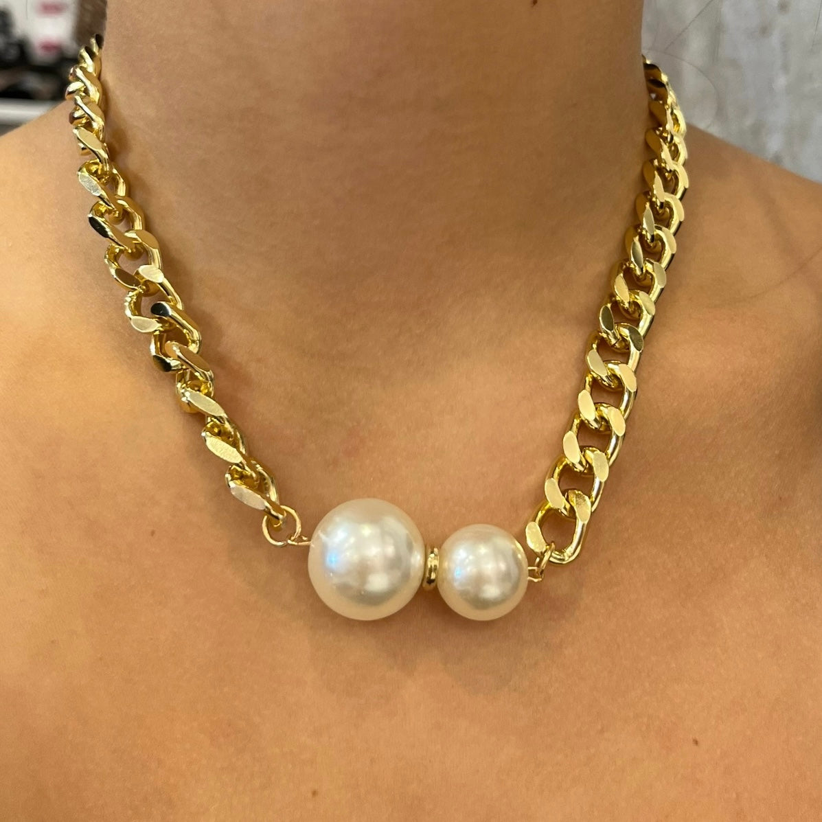 Our chain double pearl necklace is a modern twist on a timeless classic. Featuring two luminous pearls suspended on a sleek gold chain, this piece balances elegance with edge. Effortlessly chic and endlessly versatile, it’s perfect for layering or wearing solo as a subtle statement.