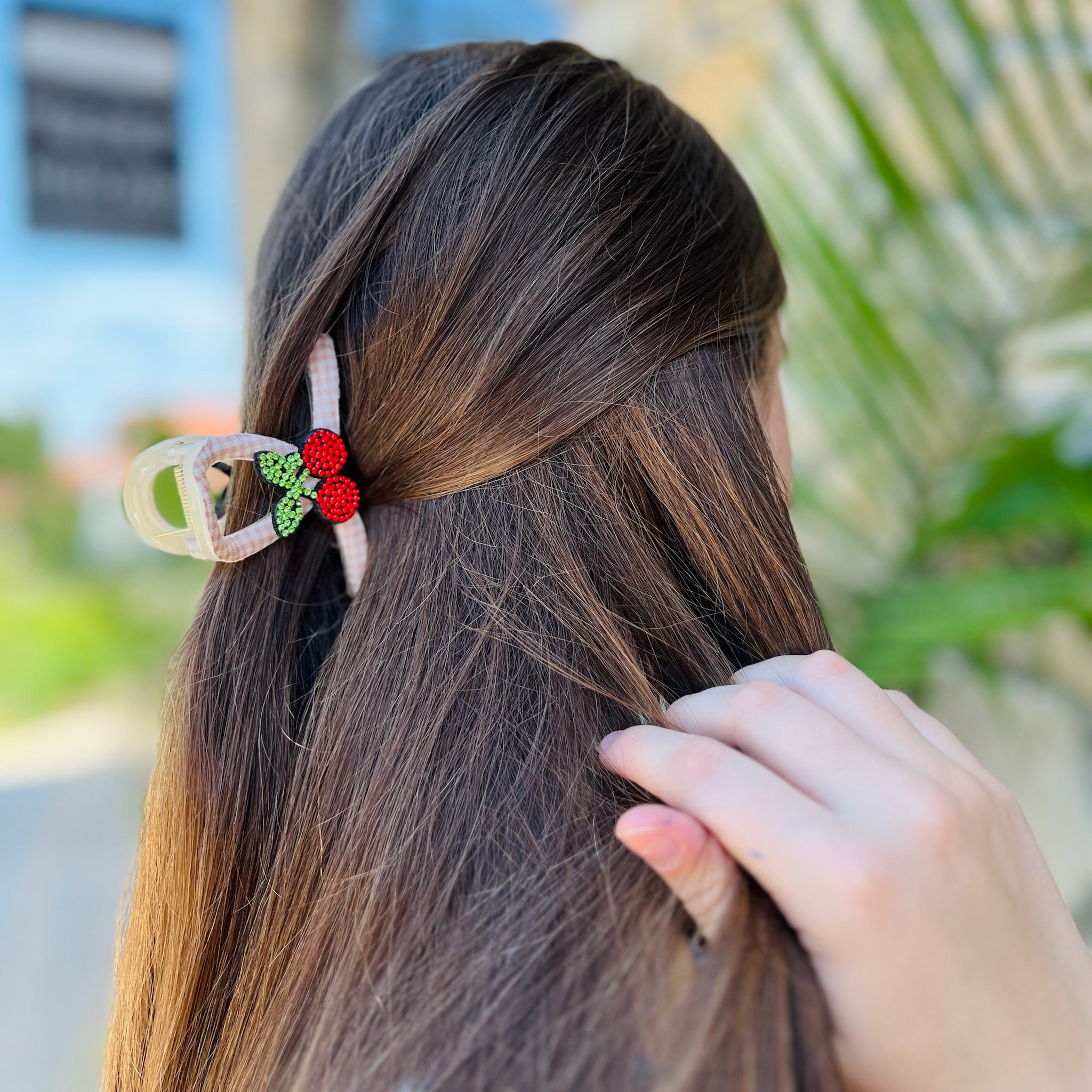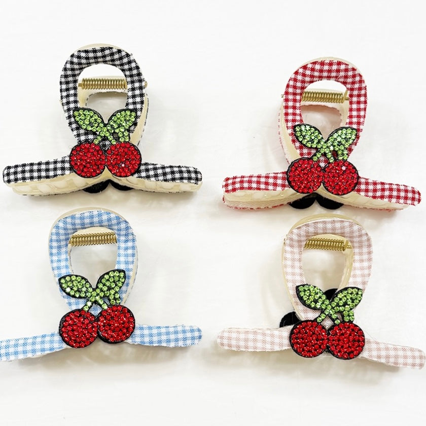 Sweet, sparkly, and oh-so-retro! These gingham-wrapped claw clips are topped with glittering cherry patches for the perfect pop of playful charm. Available in a range of classic colors—blue, black, pink, and red—each clip gives major picnic-day energy with a dash of sparkle!