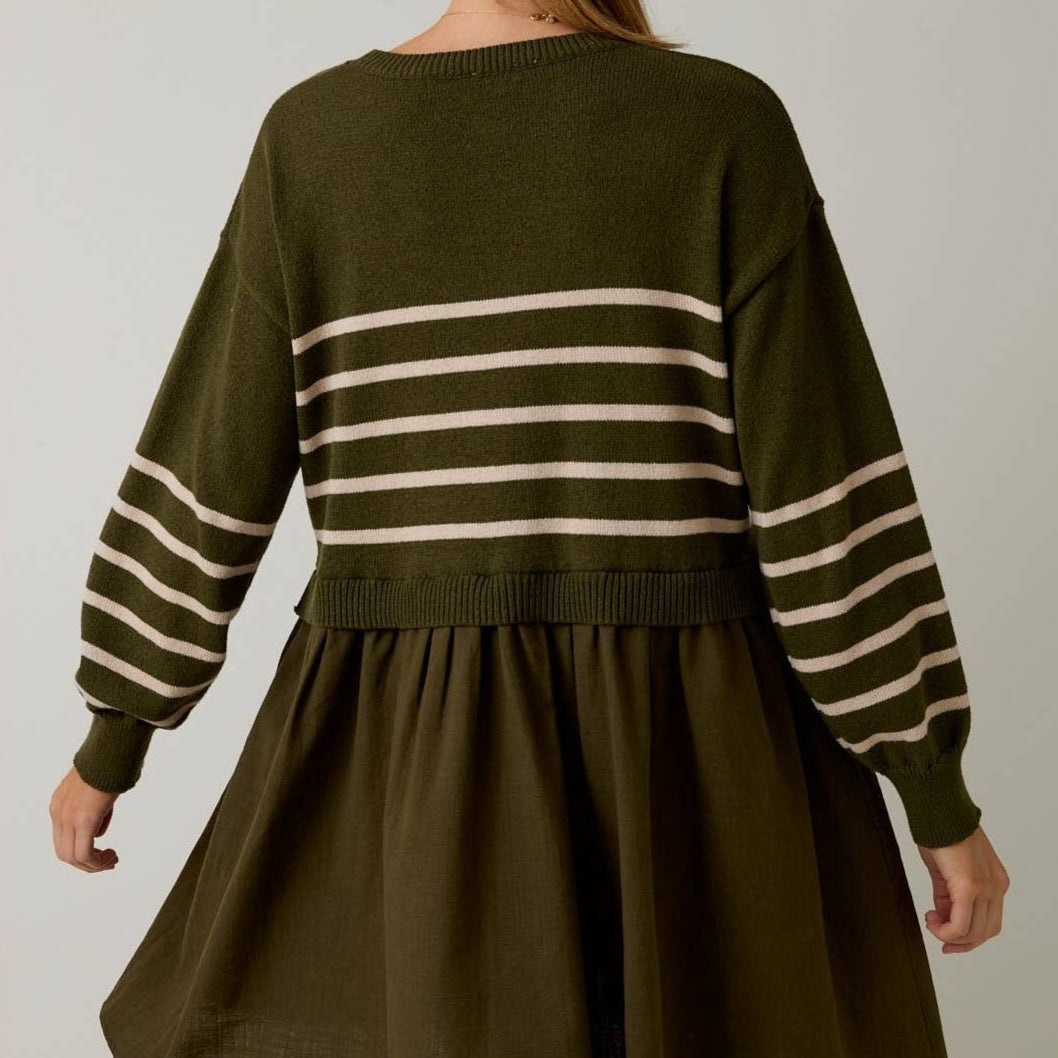 Say hello to your new fall favorite - this cute olive green striped dress. This playful yet chic piece blends cozy knit stripes with a flattering woven silhouette, giving it that effortless "styled but comfy" vibe. With its cream-and-olive stripe combo, crew neckline, and long sleeves, it’s the perfect dress to pair with boots, tights, and maybe even a wide-brim hat. Whether you’re headed to a pumpkin patch, fall festival, or just snapping those autumn photo-op moments, this little mini makes every plan look cuter.
