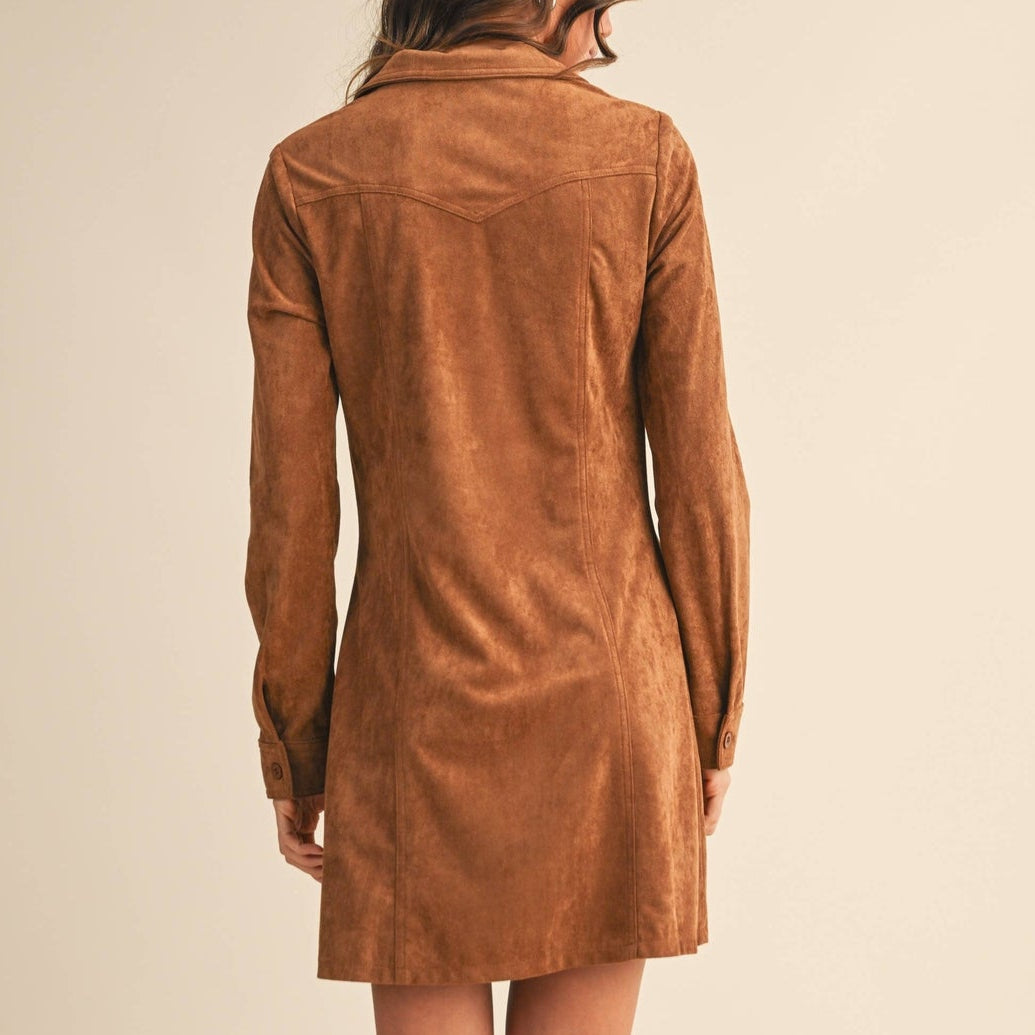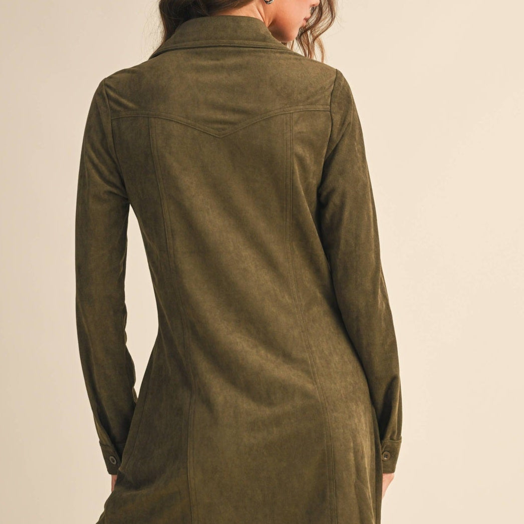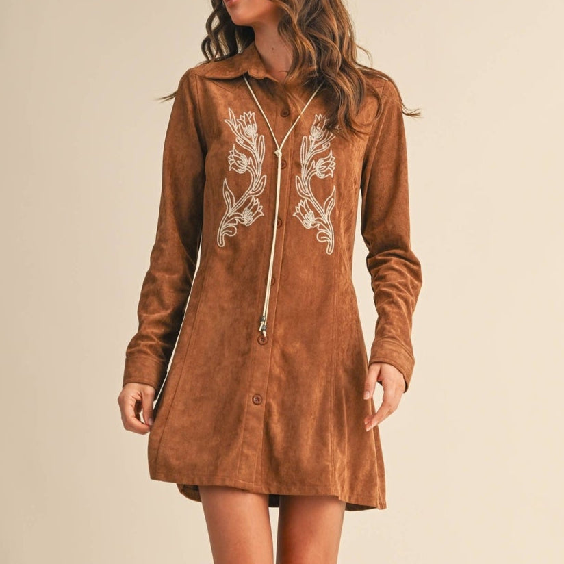 Step into western chic with this embroidered faux suede mini dress - a fall favorite that blends boho flair with timeless style. The collared, button-down design and cuffed sleeves give it just the right amount of structure, while the flared silhouette keeps it feminine and fun. Perfect for concerts, game days, or weekend outings, it pairs effortlessly with cowboy boots, layered jewelry, and a wide-brim hat. Available in olive and caramel mocha, this dress is made for everything from fall festivals to holiday gatherings and is right on trend with the season’s boho western vibe.