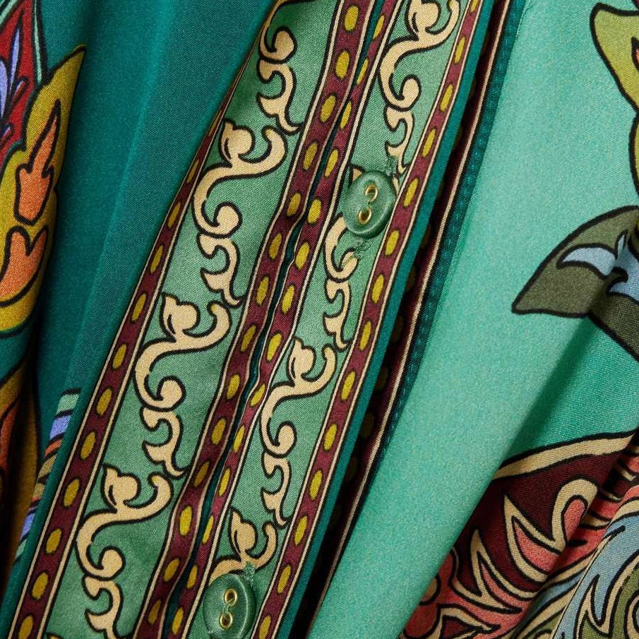 Make a bold yet timeless statement in this stunning peacock green midi dress, featuring a rich multicolor vintage-inspired print. The elegant collared neckline, dramatic lantern sleeves, and flattering self-tie waist come together to create a silhouette that’s both effortless and elevated. A front skirt slit adds a subtle touch of movement and allure, perfect for everything from workdays to weekend outings. Whether styled with boots or heels, this dress is a head-turner in any season.