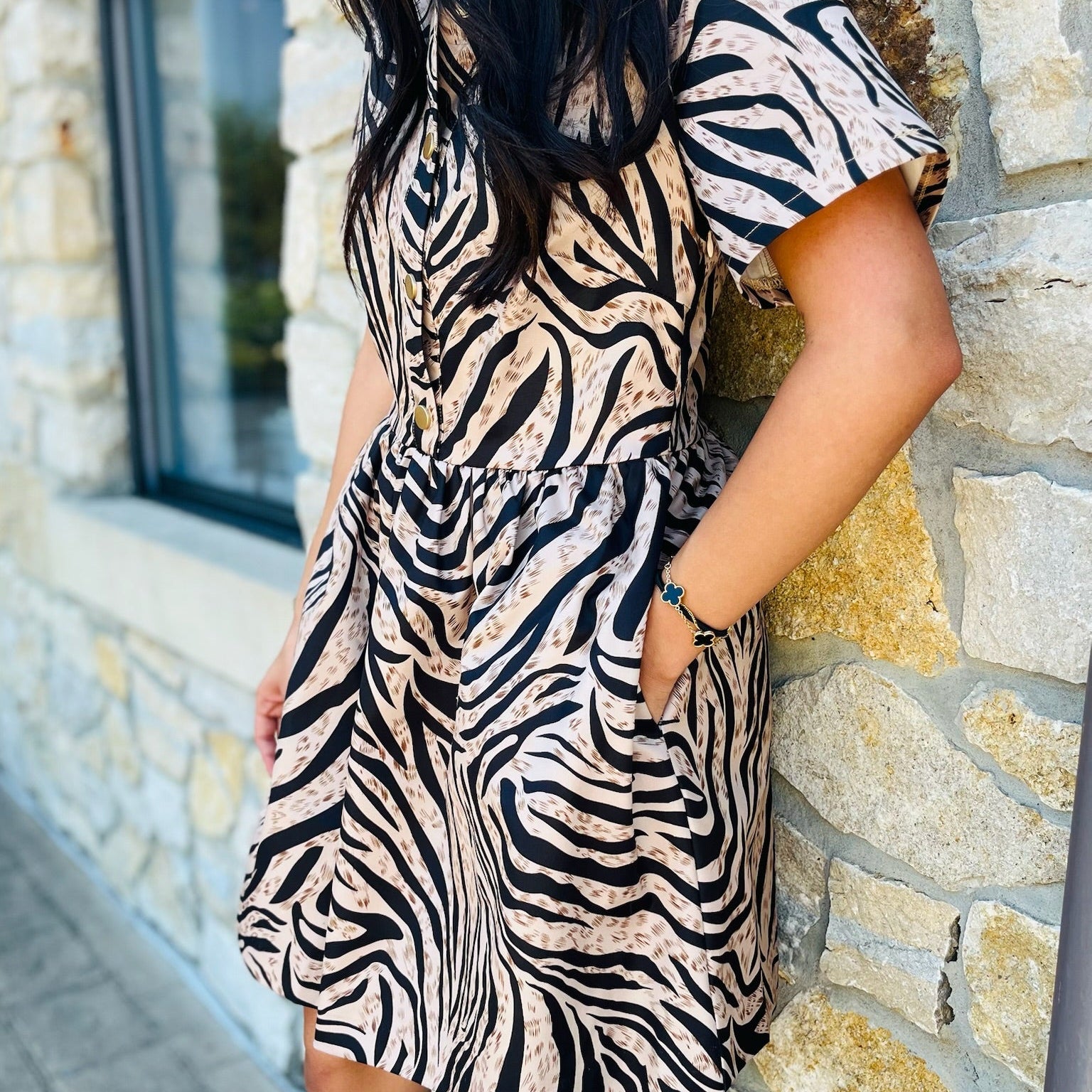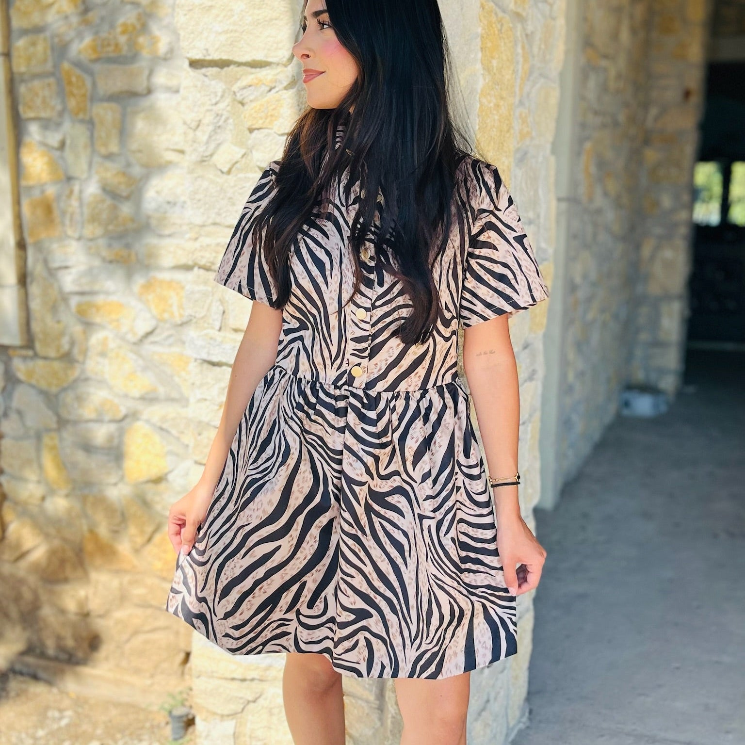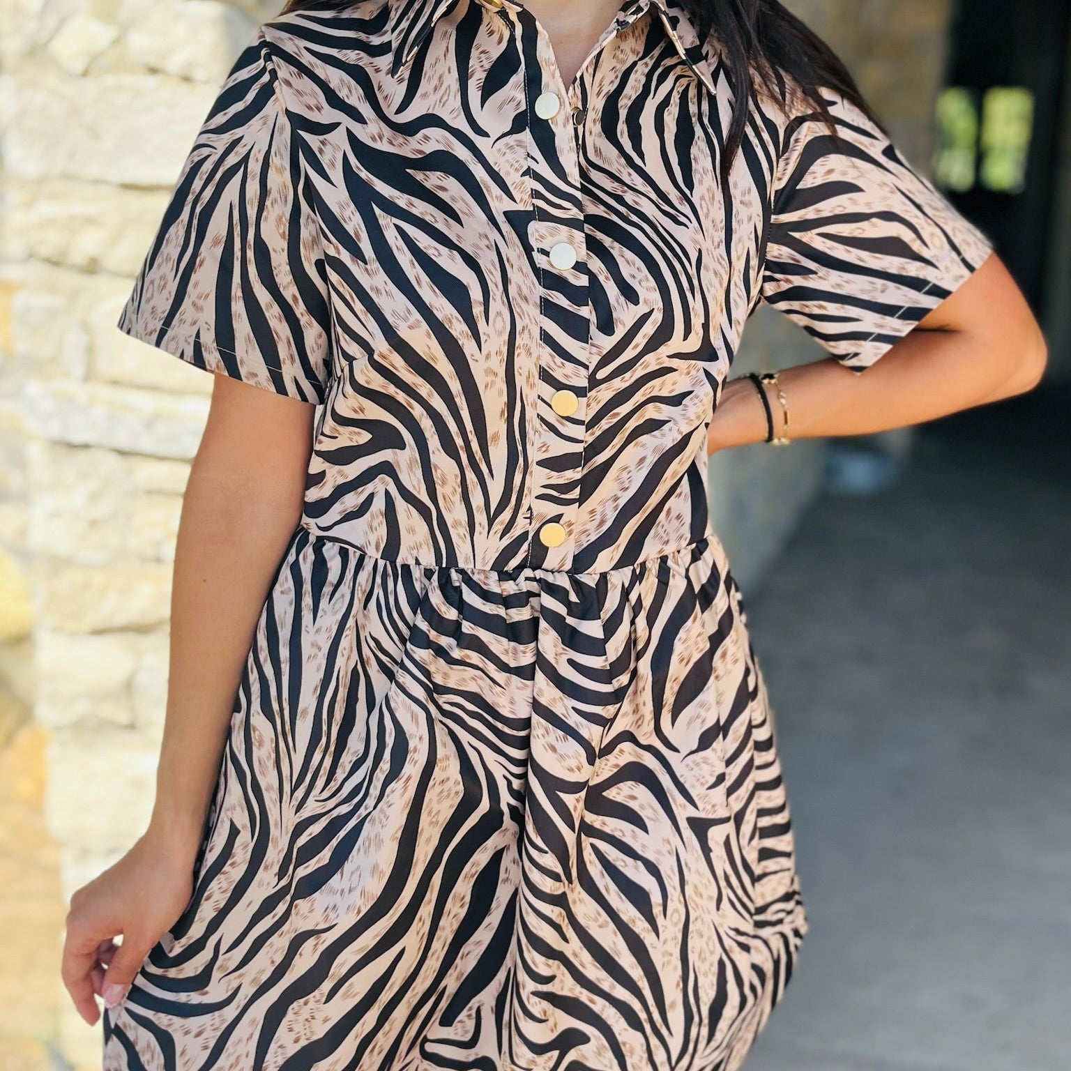 Bold, sleek, and effortlessly versatile - this zebra print shirt dress is the statement piece your wardrobe’s been waiting for. Crafted in a luxe stretchy satin twill with a puff mini skirt, gold button details, and a flattering spread collar, it’s perfect for everything from workdays to dinner dates to vacation nights out. Short sleeves, side pockets, and a lined finish make it as practical as it is striking. Dress it up with heels and jewelry or down with sneakers and a denim jacket - no matter how you style it, this dress guarantees all eyes on you.
