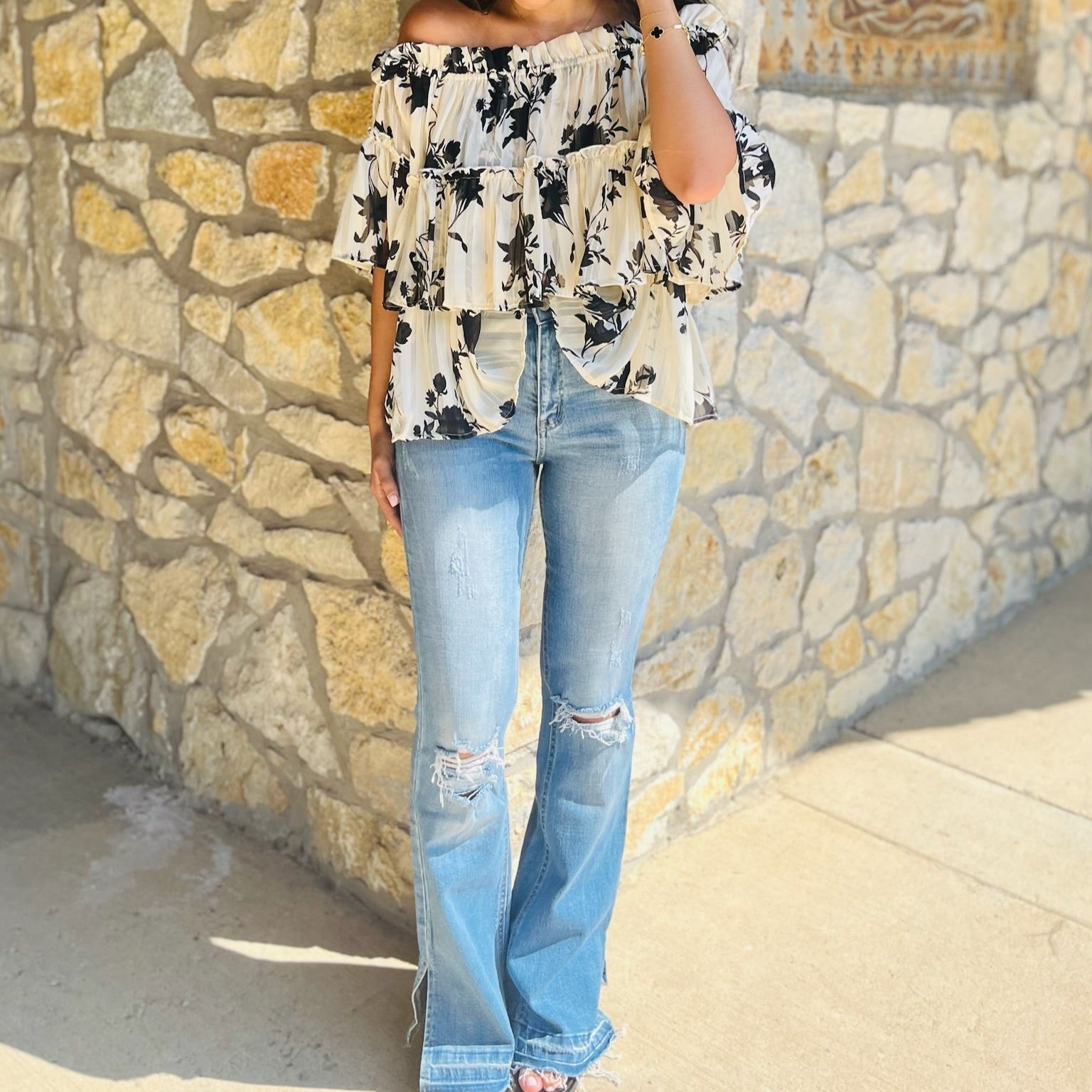 Feminine & floral comes to life in this gorgeous top! The off the shoulder top adds a fun twist in addition to the floral print!