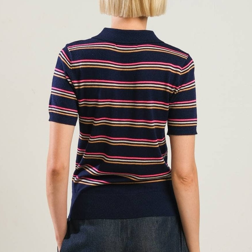- Meet your new go-to fall staple - this navy striped polo sweater blends preppy charm with effortless versatility. Featuring a collared neckline, button-down detail, and short sleeves, it’s perfect for layering under blazers at work, pairing with denim for a casual weekend look, or even styling for game day. The soft knit with a touch of wool keeps it cozy without being too heavy, making it an ideal transitional piece. Classic stripes meet timeless style in this chic little top you’ll reach for all season long.