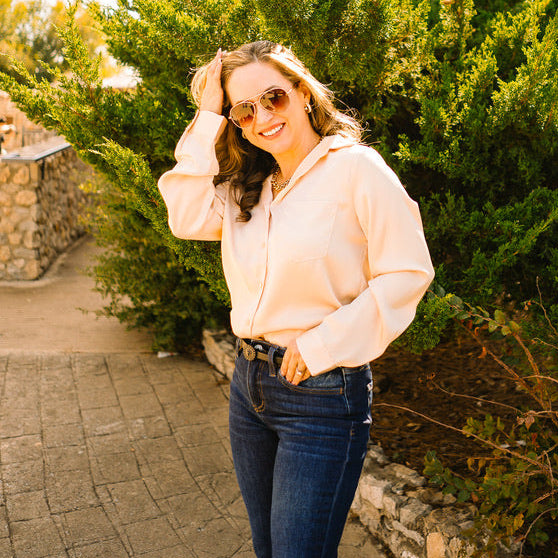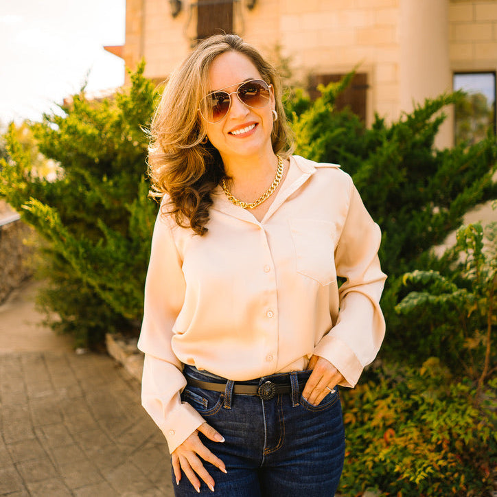 - This bestselling satin blouse is the ultimate wardrobe chameleon - polished enough for the office, elevated enough for date night, and effortlessly chic for everyday wear. Featuring a silky satin feel, classic collar, and a relaxed, generous fit, it flatters every body and every occasion. Available in a range of rich, solid colors, it's the kind of timeless piece you’ll reach for again and again - whether you're closing deals or grabbing drinks with the girls.