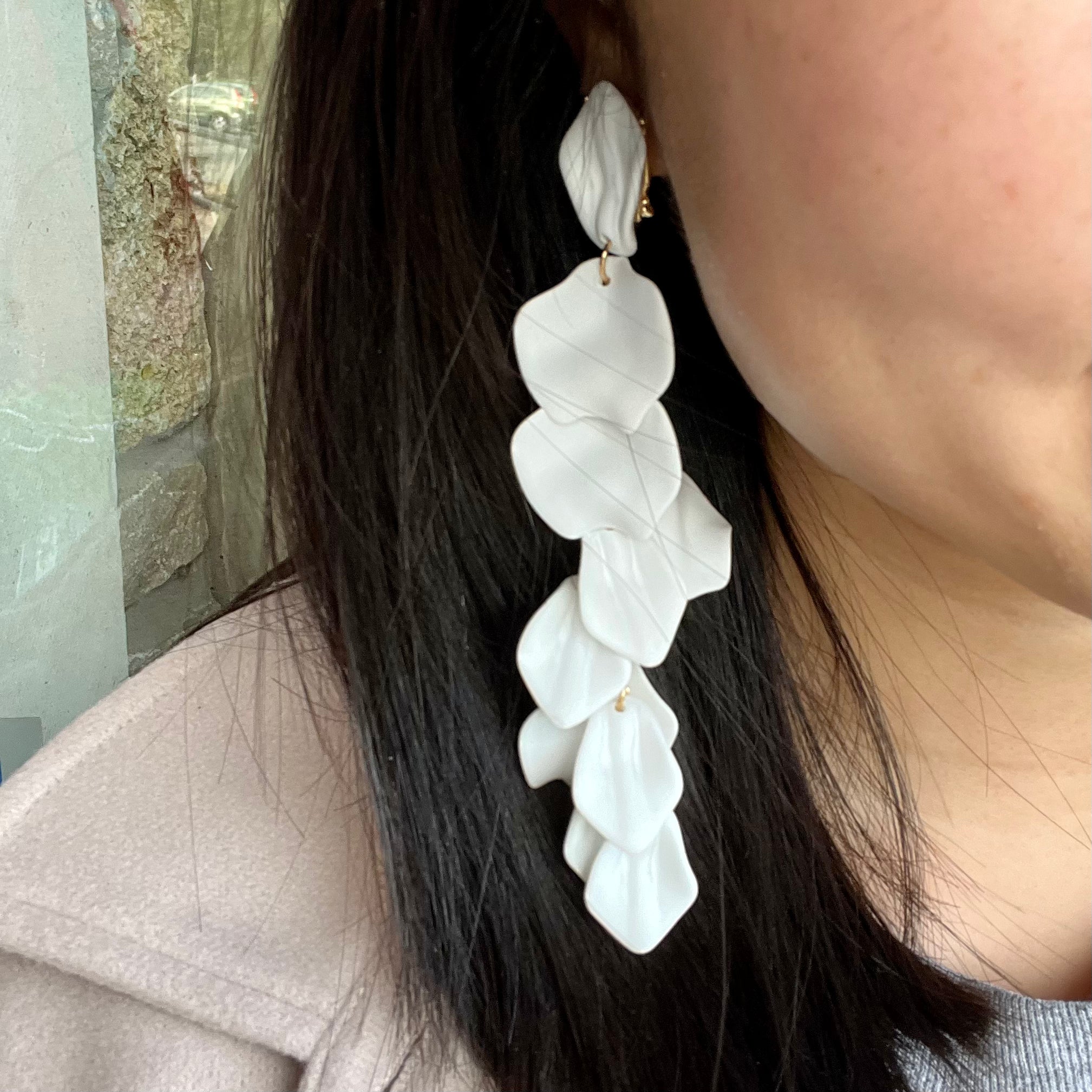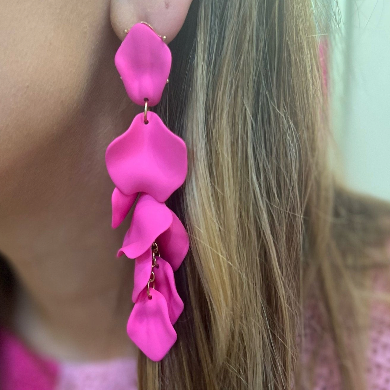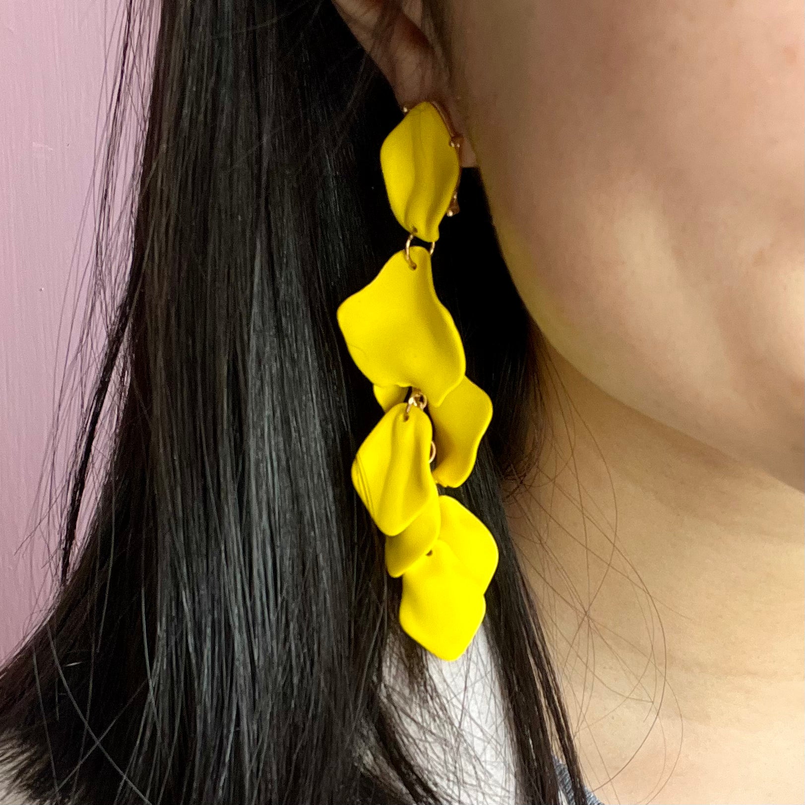 petal earrings, flower petal earrings, dangle earrings, flower dangle earrings, red earrings, pink earrings, blue earrings, colorful earrings, long dangle earrings, statement earrings, prom earrings, homecoming earrings, formal earrings, petal detail earrings, fun spring earrings, fun earrings, yellow earrings, orange earrings