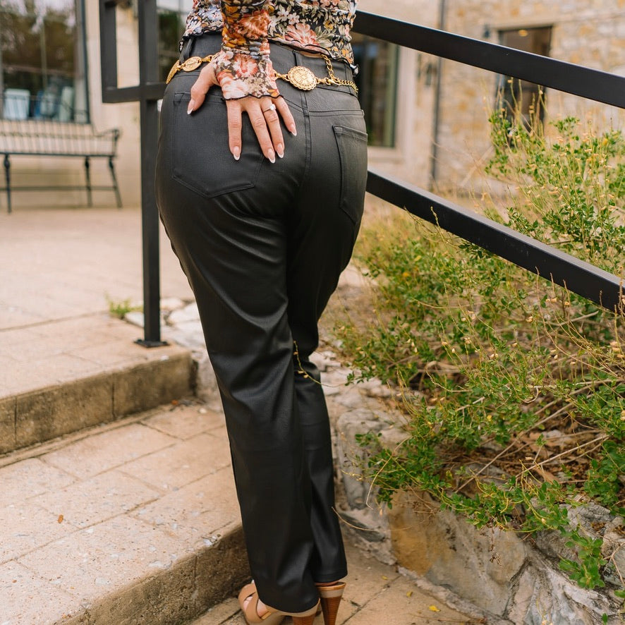 - Turn up the heat in these seriously stunning leather jeans - the ultimate statement piece for your fall wardrobe. Designed with a sleek high-rise fit, a wide double-button waistband, and comfort stretch, they deliver both style and a flattering silhouette. The skinny-straight cut makes them perfect for pairing with everything from oversized sweaters to fitted bodysuits or chic blouses. Whether you’re heading out for a night on the town or dressing up your daytime look, these jeans are too hot to handle in the best way possible.