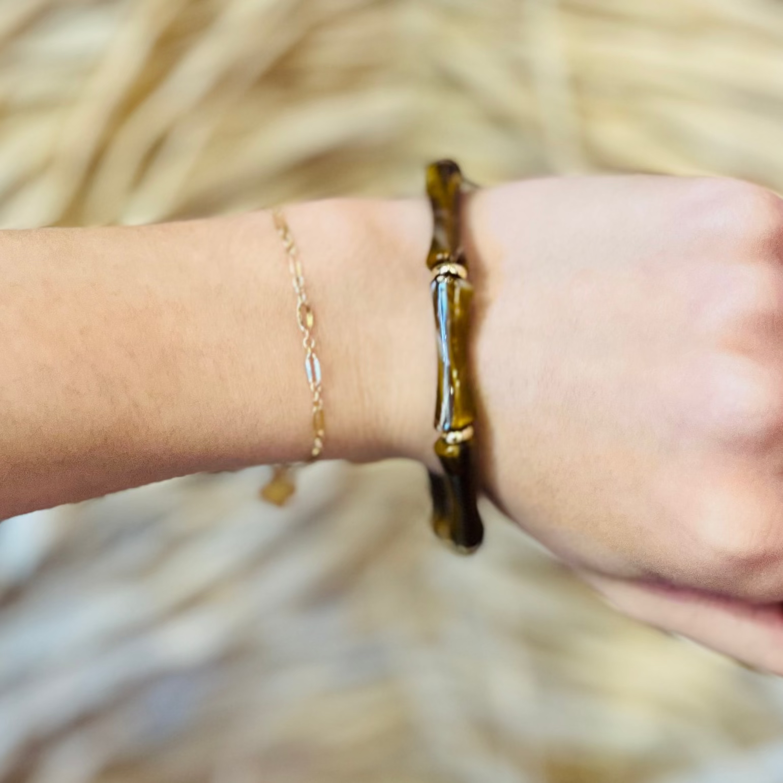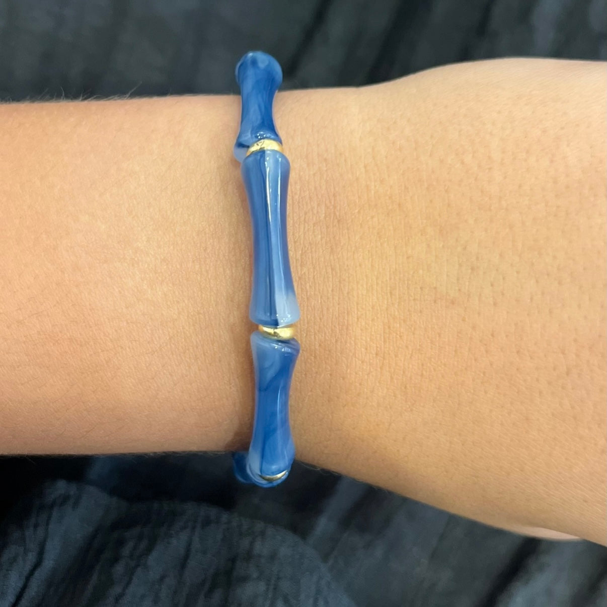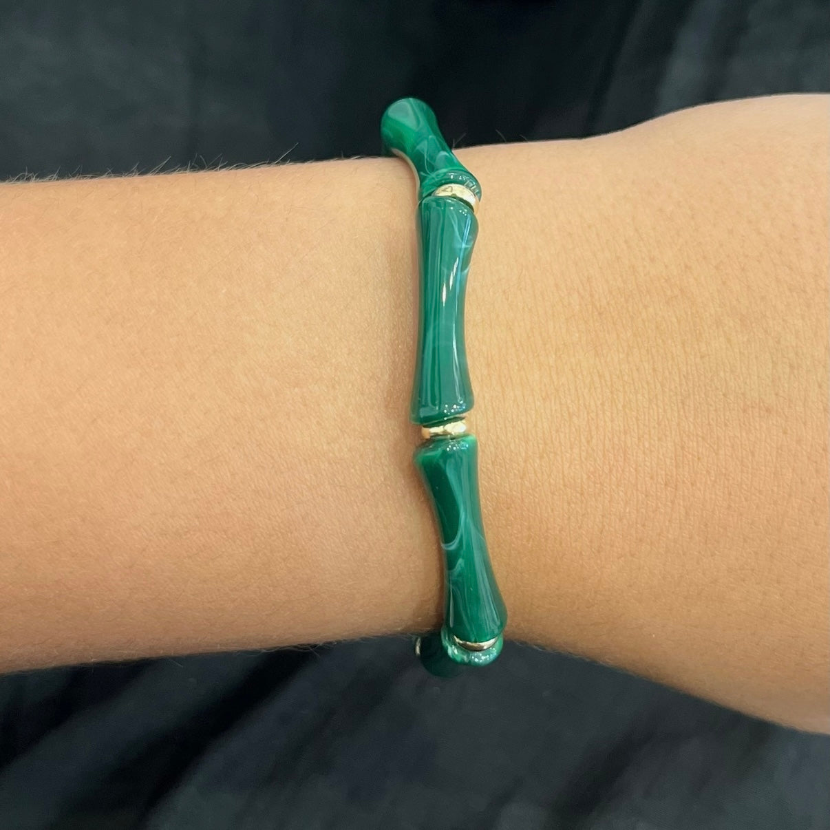 Add a splash of playful polish to your wrist with this eye-catching acrylic bracelet, featuring bold colors of green, blue, and crystal-clear tones accented with gleaming gold details