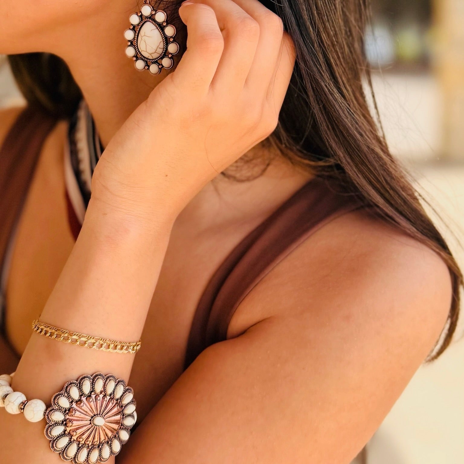 - Channel your inner country star with this marble stone bracelet, accented with western-inspired flair. The perfect piece to stack with bangles or wear solo, it transitions seamlessly from rodeos and country concerts to casual outings with denim and boots. A timeless accessory that elevates everyday looks while leaning into the western trend that’s back and bigger than ever.