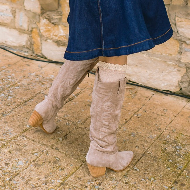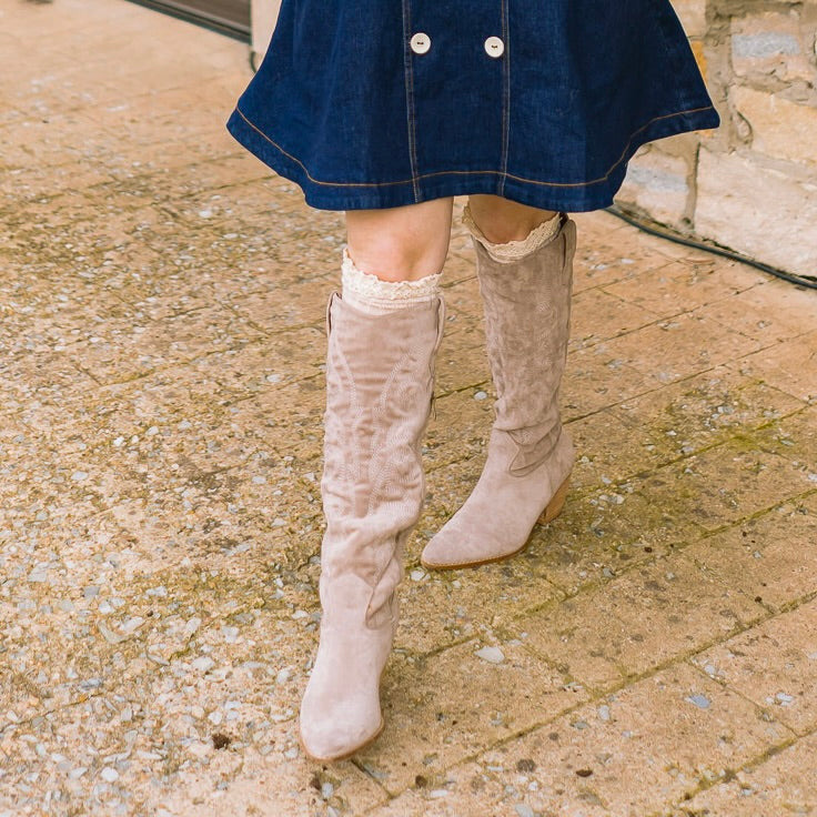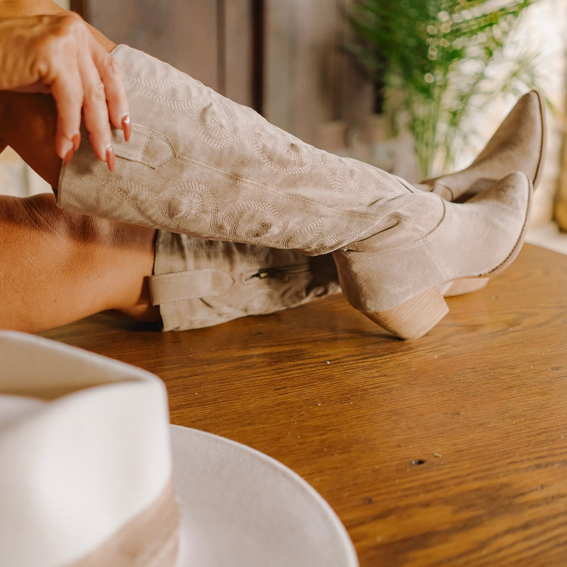 Step into effortless western chic with these embroidered faux suede boots; the perfect mix of style and comfort for fall and beyond. Featuring a tapered silhouette, low block heel, and side pull tabs, these boots are easy to slip on while making a fashion-forward statement. The closed pointed toe and grayish-brown hue pair beautifully with denim, skirts, or dresses, bringing a touch of rustic sophistication to any outfit. Faux suede and PU leather construction ensures they’re stylish yet durable, ideal for weekend adventures, concerts, or casual outings.