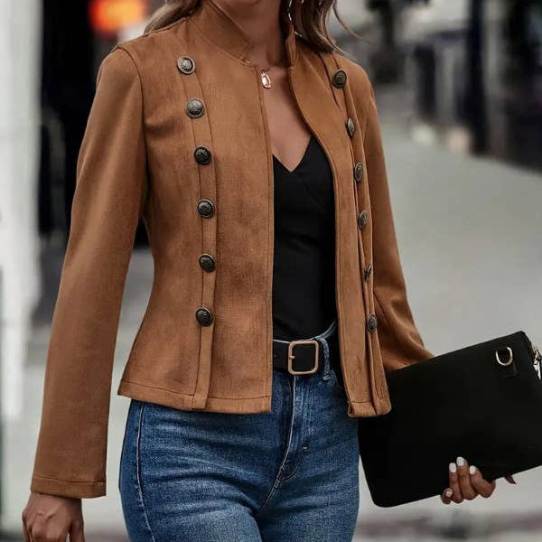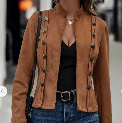 Add a touch of vintage elegance to your wardrobe with this deerskin velvet jacket - a true statement piece with timeless appeal. Featuring a double-breasted front with detailed buttons on both sides, a structured mock neck collar, and a luxe, soft-touch finish, this jacket is as refined as it is versatile. The long sleeves and rich velvet texture make it ideal for dressing up denim, layering over dresses, or elevating a minimalist look. Classic, cozy, and effortlessly chic - it’s the kind of jacket that turns heads season after season.