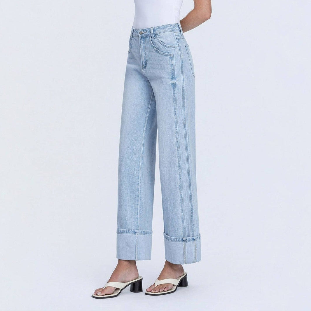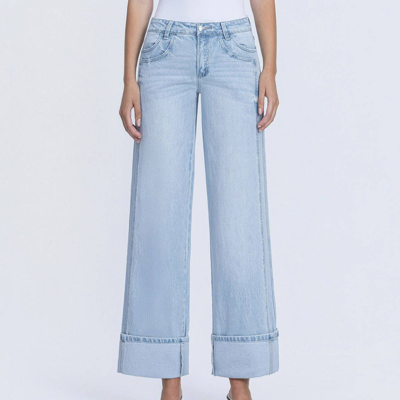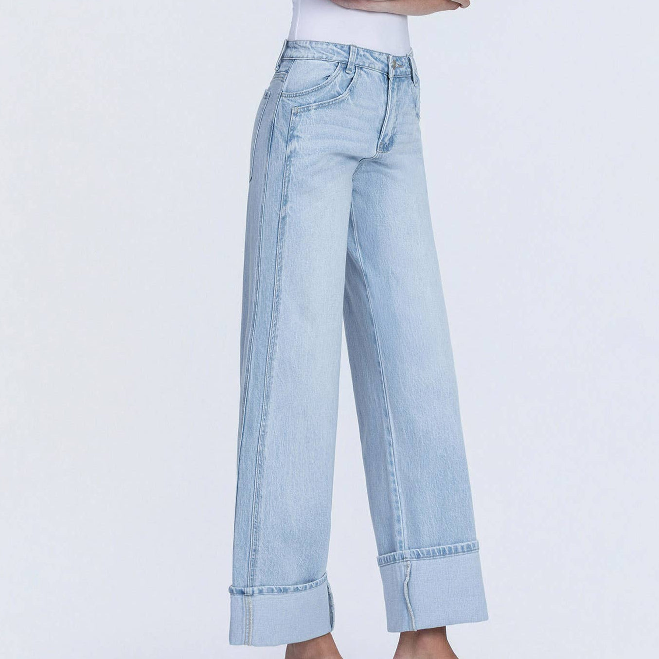 - Baggy denim is back and so stylish! These light wash jeans are the ultimate everyday staple with a cool, laid-back edge. The super high-rise fit and baggy wide-leg silhouette create an effortlessly flattering shape that feels both on-trend and timeless. The cuffed hem and seam detailing add just enough interest to elevate a simple outfit, making them easy to style with everything from fitted tanks and sneakers to cozy knits and heels. Comfortable, versatile, and endlessly wearable, these are the kind of jeans you’ll reach for season after season!
