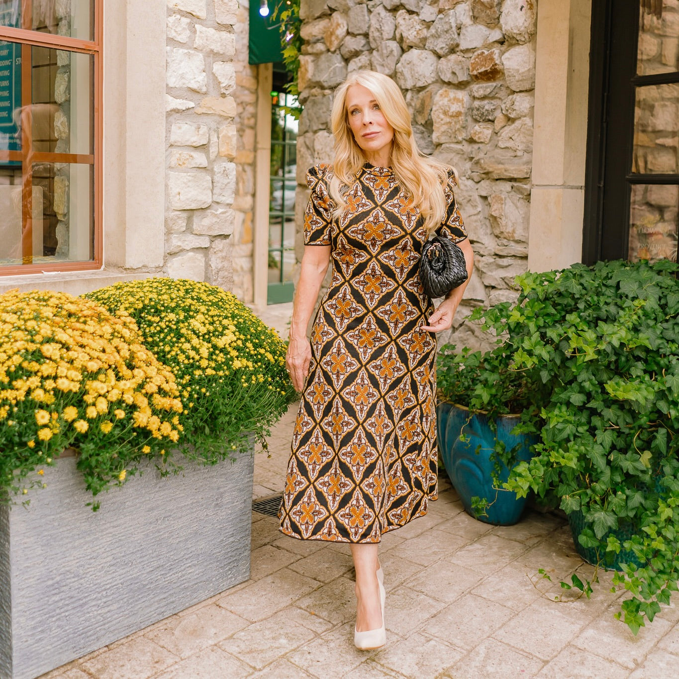 Turn heads this season in this midi dress - a timeless and elegant piece designed to flatter in all the right ways. Crafted in a rich jacquard knit with deep warm tones against a black base, this dress brings sophistication and subtle drama. The high neckline and slight puff short sleeves add a chic, feminine touch, while the form-fitting bodice and A-line midi skirt create a silhouette that’s both refined and comfortable. Perfect for cool-weather weddings, church, or holiday soirées, this is the dress you’ll reach for when you want to feel confident, classy, and unforgettable.