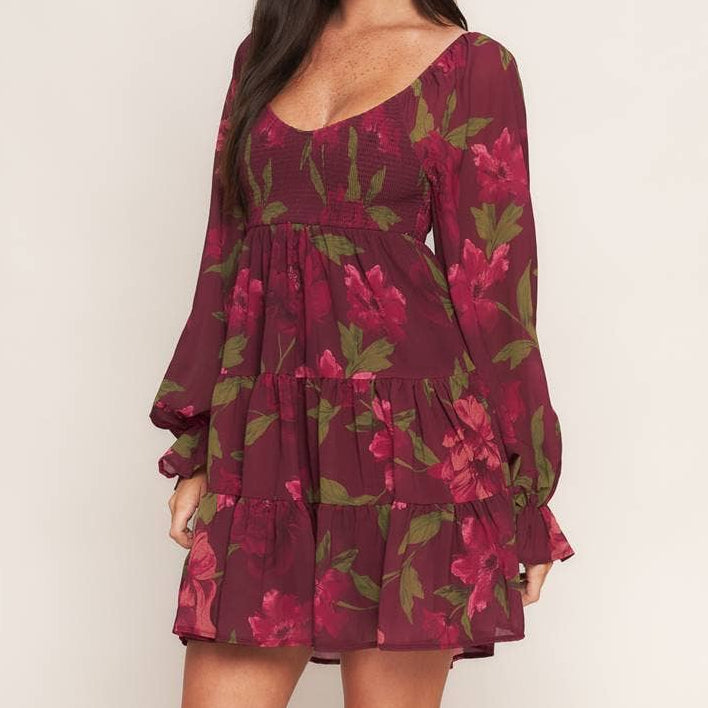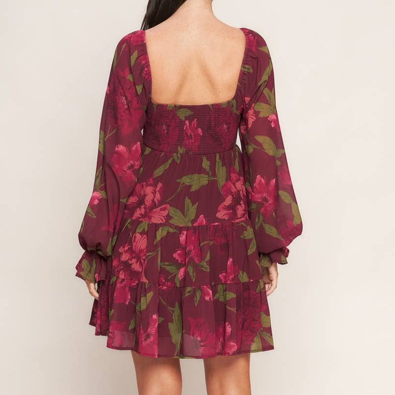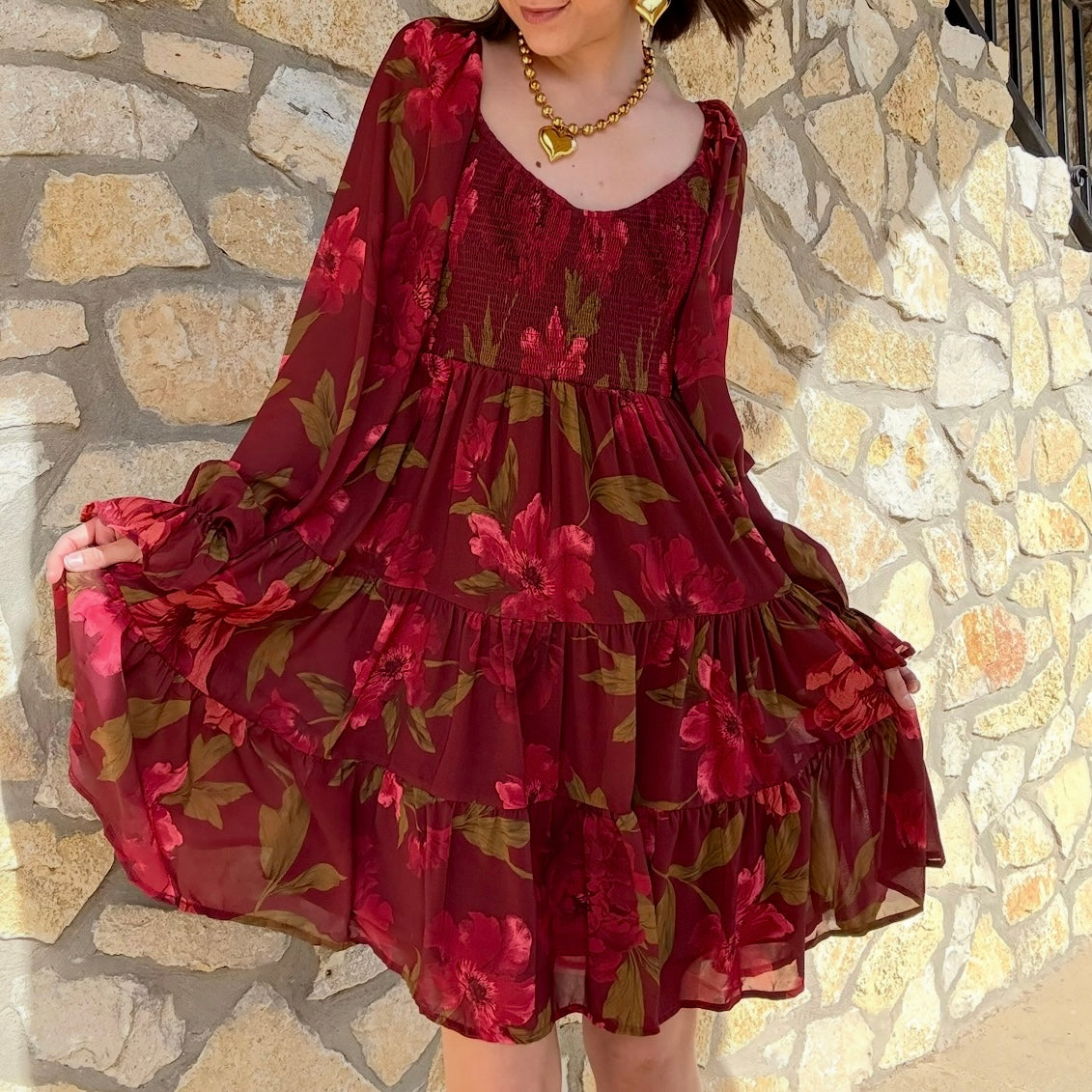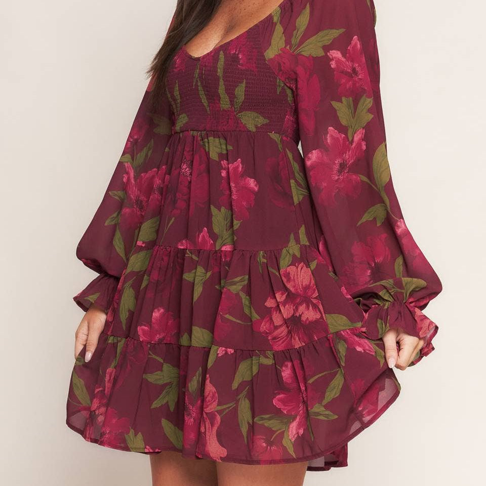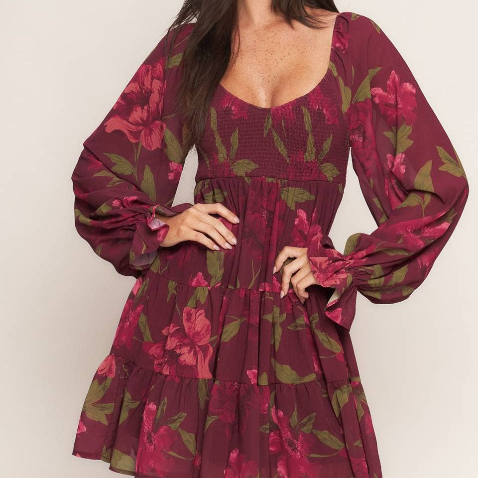 - Meet your new go-to floral mini - soft, romantic, and effortlessly flattering. This printed dress features a smocked bodice for a comfortable, custom-feel fit, a gentle U-neckline, and floaty long sleeves finished with ruffled cuffs. The tiered skirt adds playful movement with every step, while the burgundy floral print brings a rich, feminine touch perfect for brunch, showers, or casual days out. A beautiful blend of comfort and charm, this piece transitions seamlessly from everyday outings to special moments.