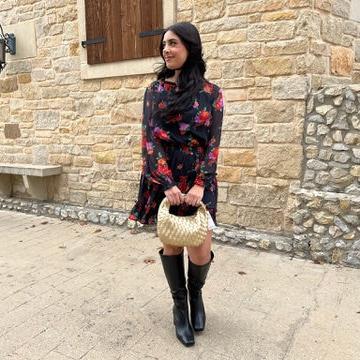 floral print dress, black floral dress, ruffle tiered dress, long sleeve floral mini dress, semi sheer sleeves dress, v notch neckline dress, tie neck dress, fall wedding guest outfit, shower and party dress, boutique floral outfit, feminine floral style, romantic ruffle dress, layered tiered mini dress, floral chiffon dress, lined lightweight dress, multicolor floral pattern, floral dress for events, dinner date outfit, cute boutique dress, black background floral print, boho chic floral dress, fall event