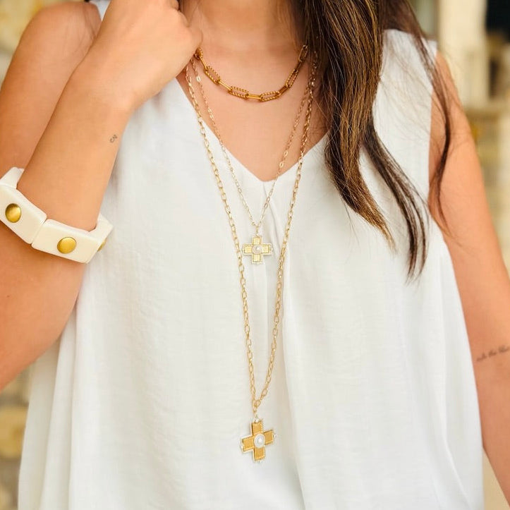 - Dainty yet full of meaning, this layered necklace is the perfect way to wear your faith in style. Featuring delicate rhinestone and pearl details with a mixed-metal cross, it’s a chic piece that adds just the right touch of sparkle to any outfit. Whether you’re dressing up for Sunday service, heading to a special occasion, or simply want a daily reminder of faith close to your heart, this necklace is a beautiful choice.