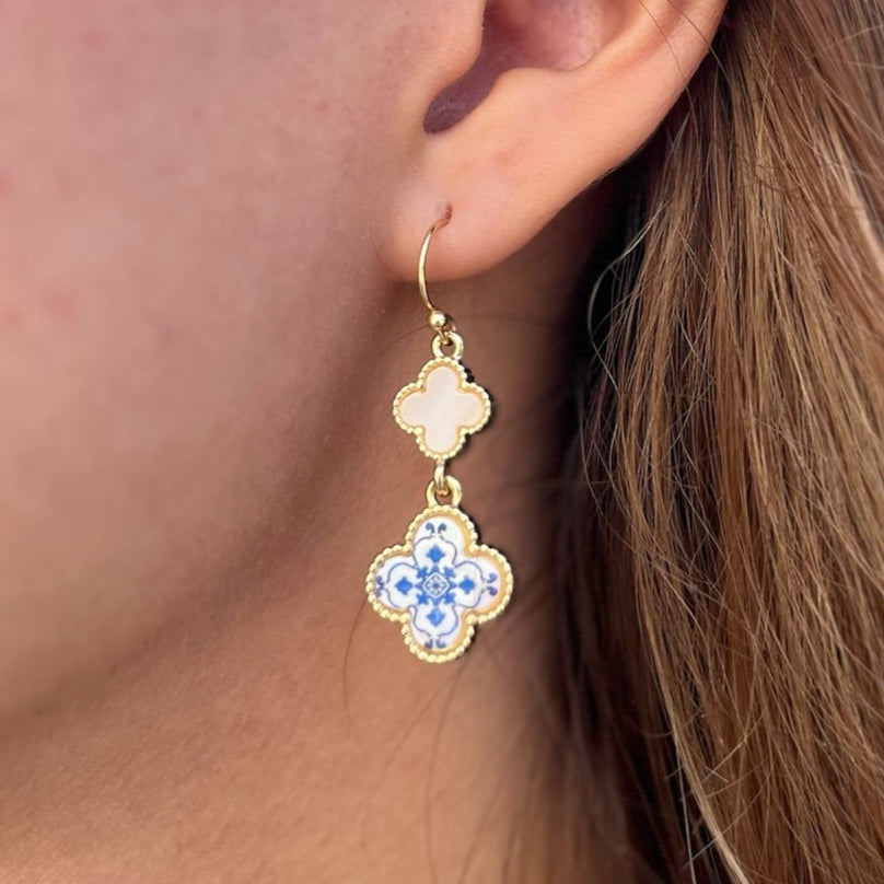 - Elegant, eye-catching, and effortlessly timeless — these earrings are your new favorite statement piece. Featuring a delicate double clover design with rich blue enamel and gleaming gold trim, these lightweight drops strike the perfect balance between bold and refined. Whether you’re dressing up denim or finishing a formal look, they add just the right pop of color and charm. A lovely gift and a must-have for year-round accessorizing.