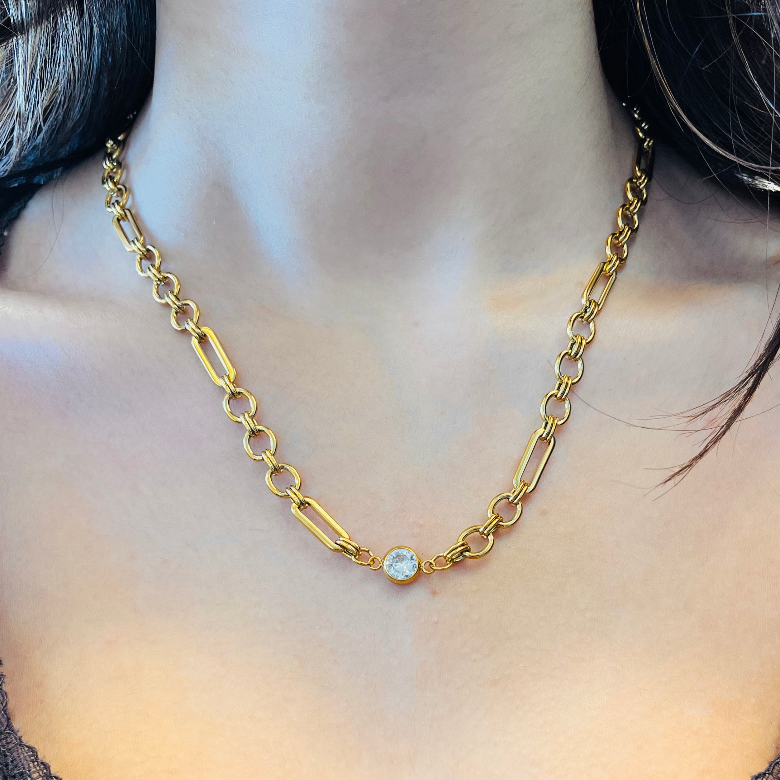 - Elevate any outfit with the effortless sophistication of our Monaco necklace! Crafted with a luxe gold-metal finish, this statement piece features a stunning blend of chain styles for a modern, dimensional look. Sparkling rhinestone accents add just the right touch of glamour - perfect for evenings out, holiday parties, or giving your everyday wardrobe a chic upgrade.