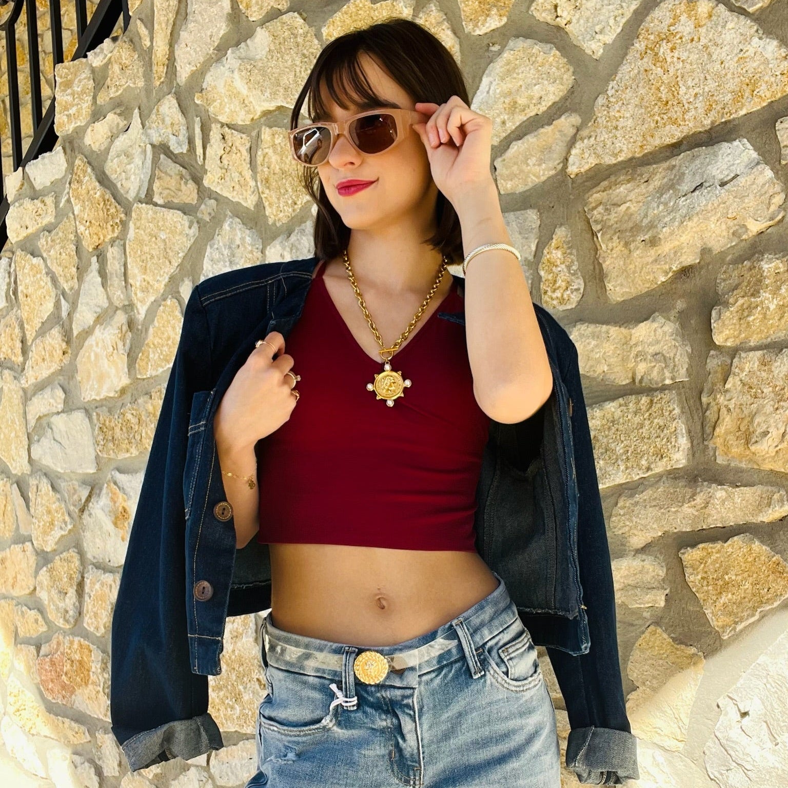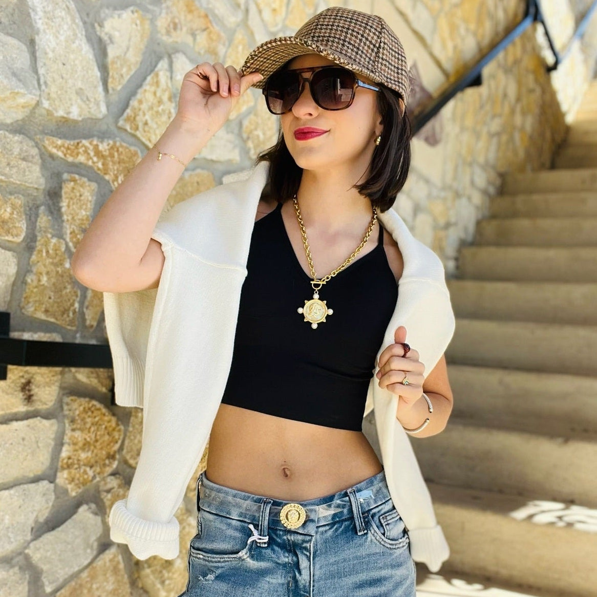 - Make a statement with this one-of-a-kind charm necklace that blends elegance with edge. The pearl accents and coin pendant bring a unique, timeless touch, while the bold chain and front toggle clasp add modern flair. Perfect for dressing up a simple blouse, layering with other chains, or adding a little sparkle to your everyday looks - this piece is versatile enough for workdays, date nights, or holiday gatherings.
