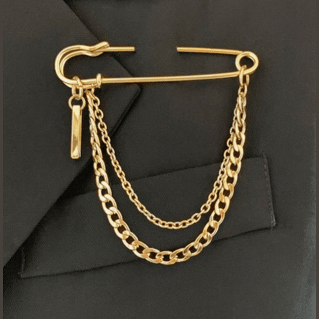 - Edgy, chic, and so fun to style - this safety pin–inspired brooch is the cutest way to add personality to any outfit! The gold-tone finish gives it a polished touch, while the delicate chain and charm detail add just the right amount of flair. Pin it on your jacket, bag, or sweater for an instant style upgrade.
