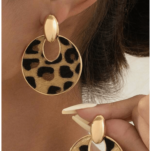 - Bring a little wild flair to your look with these stunning leopard statement earrings! The cut-out circular pendant paired with a sleek oval stud creates the perfect mix of bold and modern, while the gold accents add just the right touch of glam. Eye-catching yet easy to wear, they’re the kind of earrings that instantly elevate any outfit - from a simple tee to a night-out look.