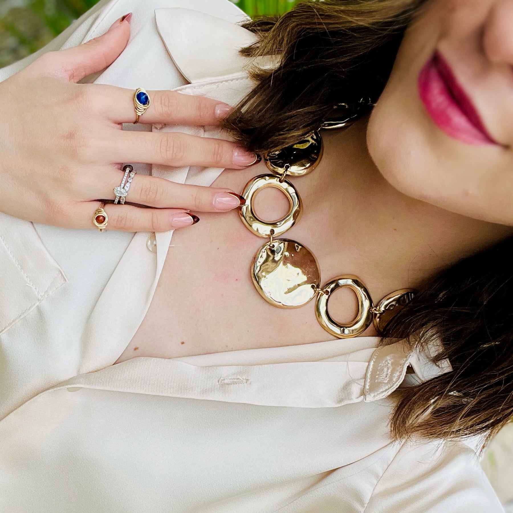 Make a bold statement with this gold-tone hammered link necklace. Featuring a series of textured circular and oval-shaped links, this piece blends modern design with timeless elegance. The hammered finish reflects light beautifully, adding depth and shine to your look. Pair with casual outfits or evening wear, this necklace elevates any look!