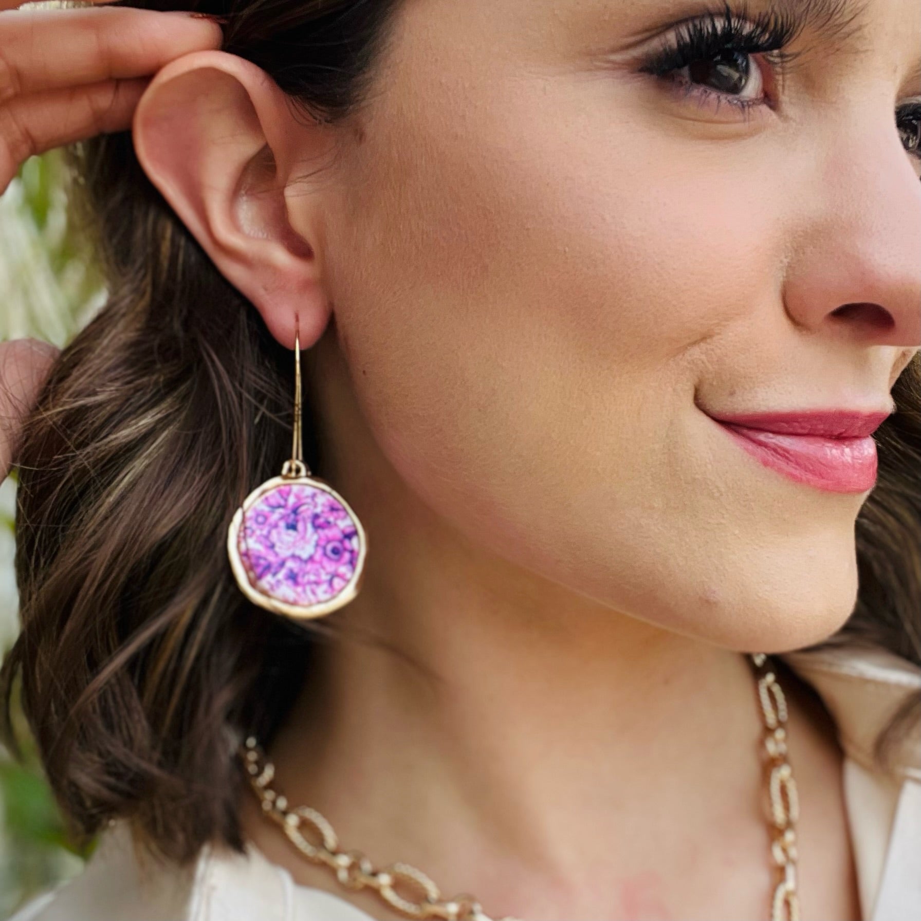 Flirty, feminine, and oh-so-girly, these floral circle earrings are the perfect finishing touch to any outfit. With their dainty design, hammered gold border, and lightweight feel, they strike the right balance between playful and polished. Available in cobalt or viola, they’re an easy go-to whether you’re dressing up for brunch, adding a pop of color to workwear, or gifting a sweet pair to someone special.