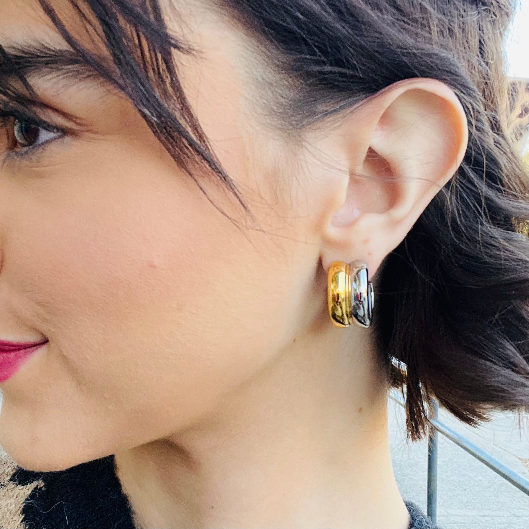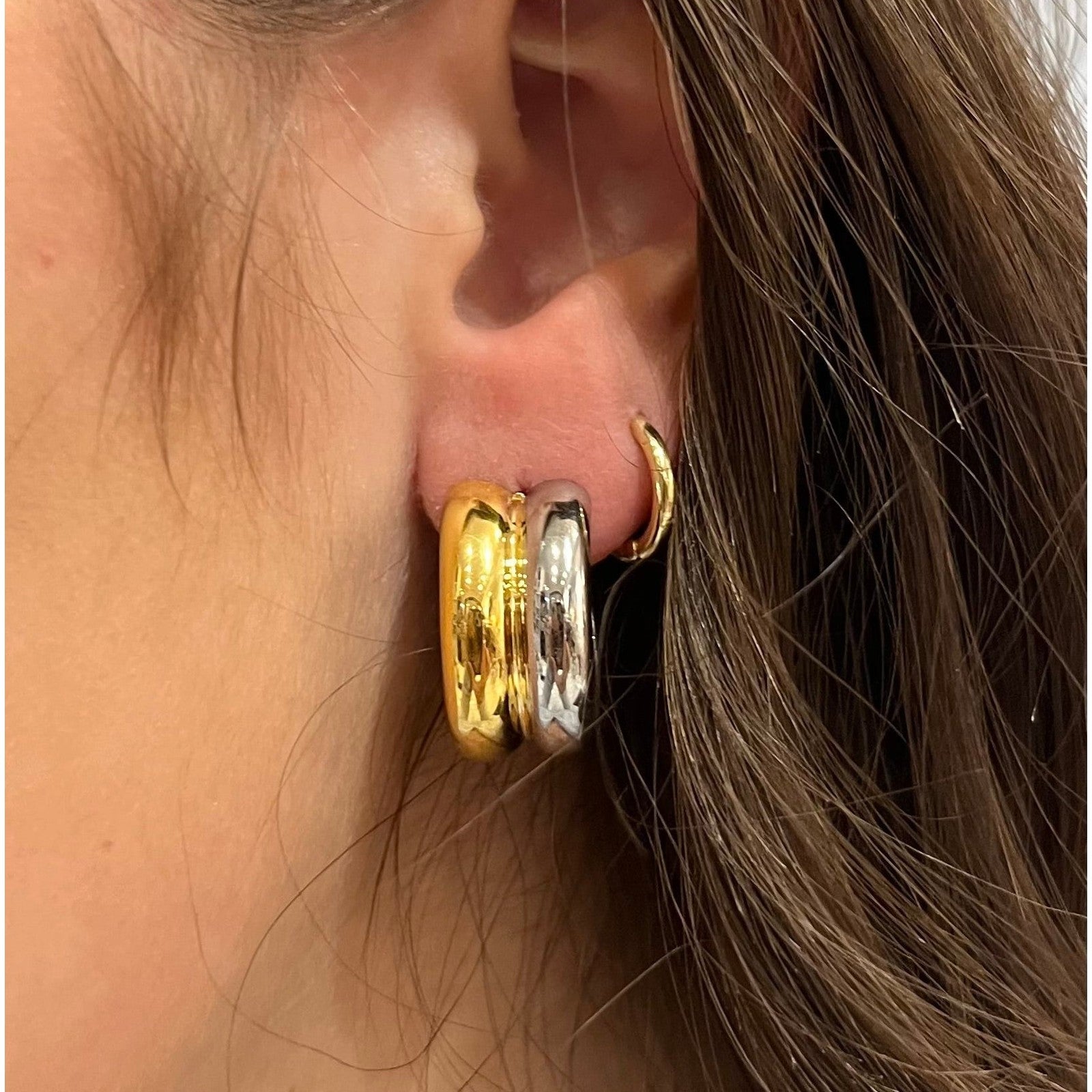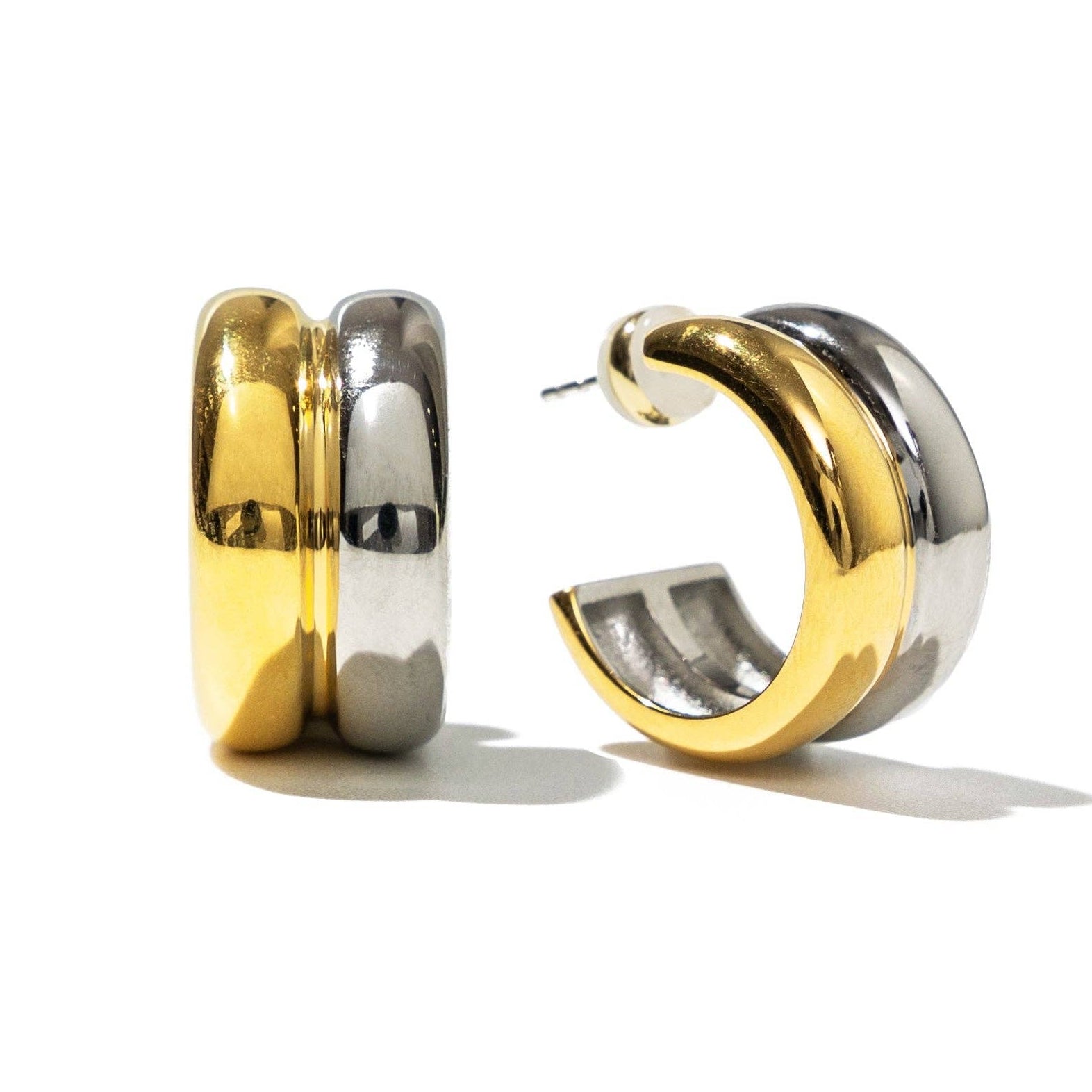 - Give your style a striking dose of contrast with the Rhodes Hoops - a bold blend of silver and gold that instantly elevates any look. Their sculptural shape and smooth layers make them feel modern, effortless, and undeniably cool, whether you're in jeans or a sleek night-out outfit. Designed for everyday confidence, they bring that polished, “put-together without trying” energy to your wardrobe. A standout pair you’ll reach for again and again.