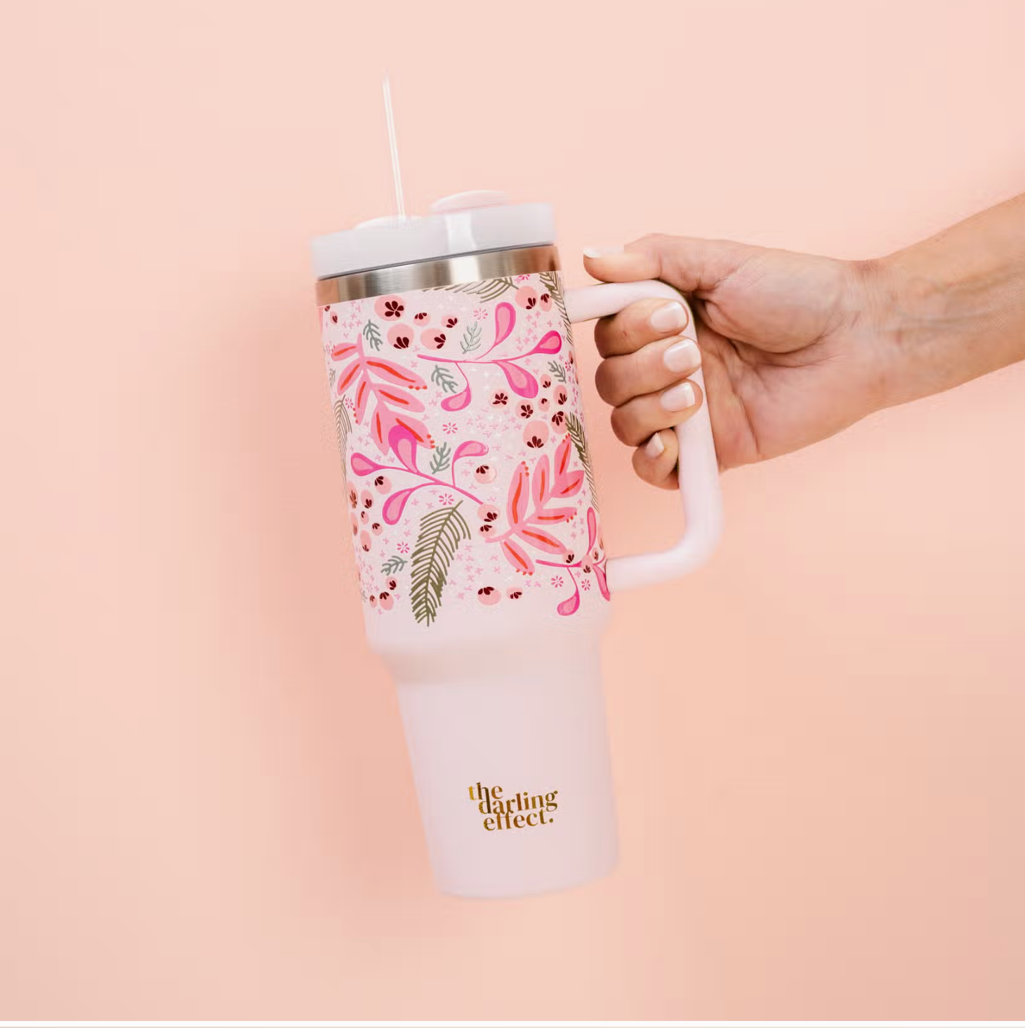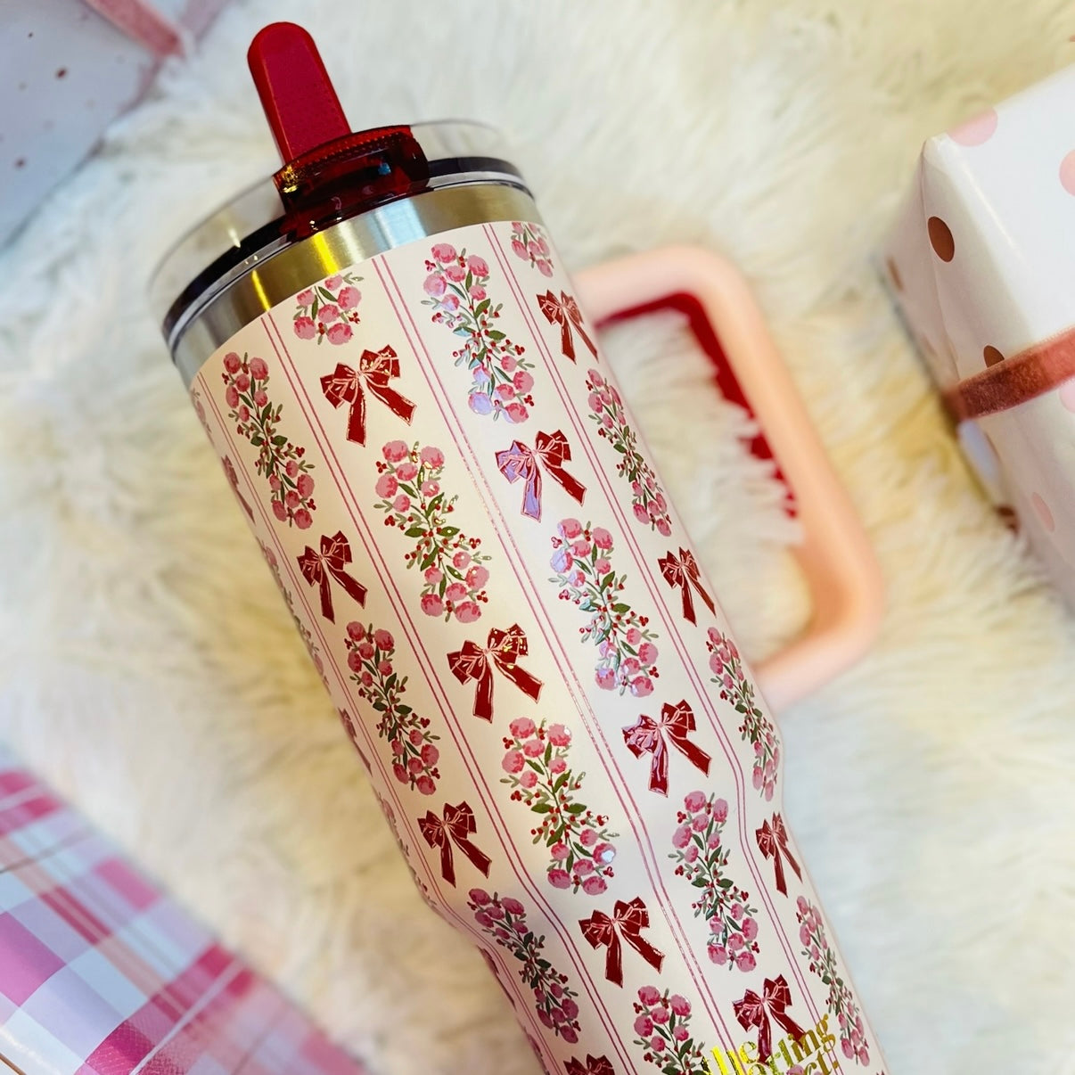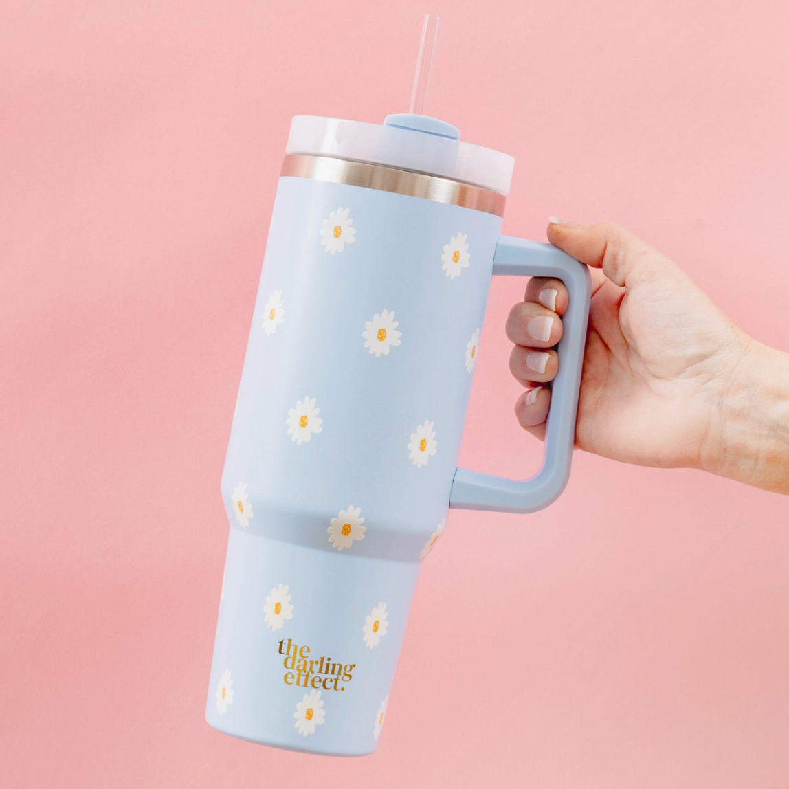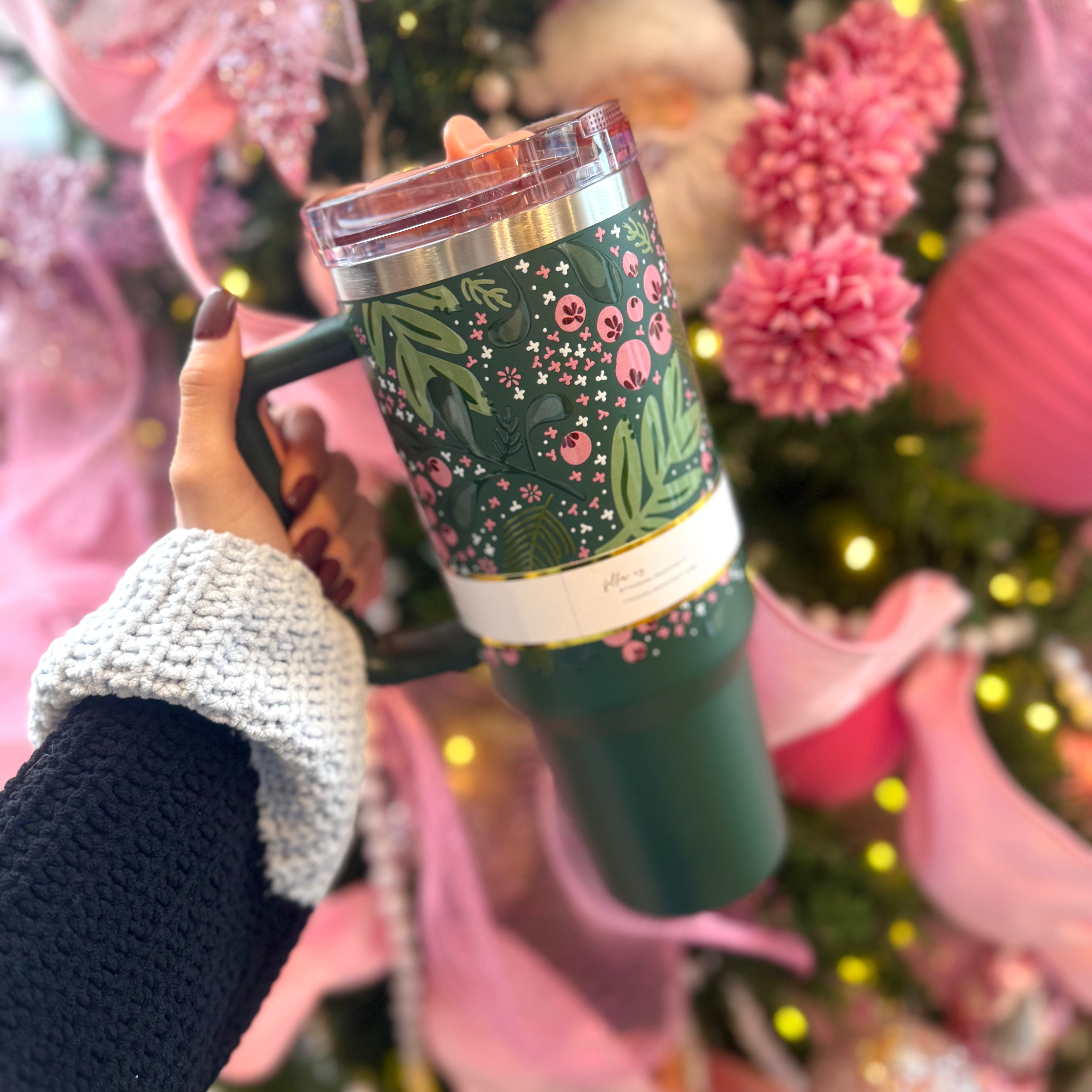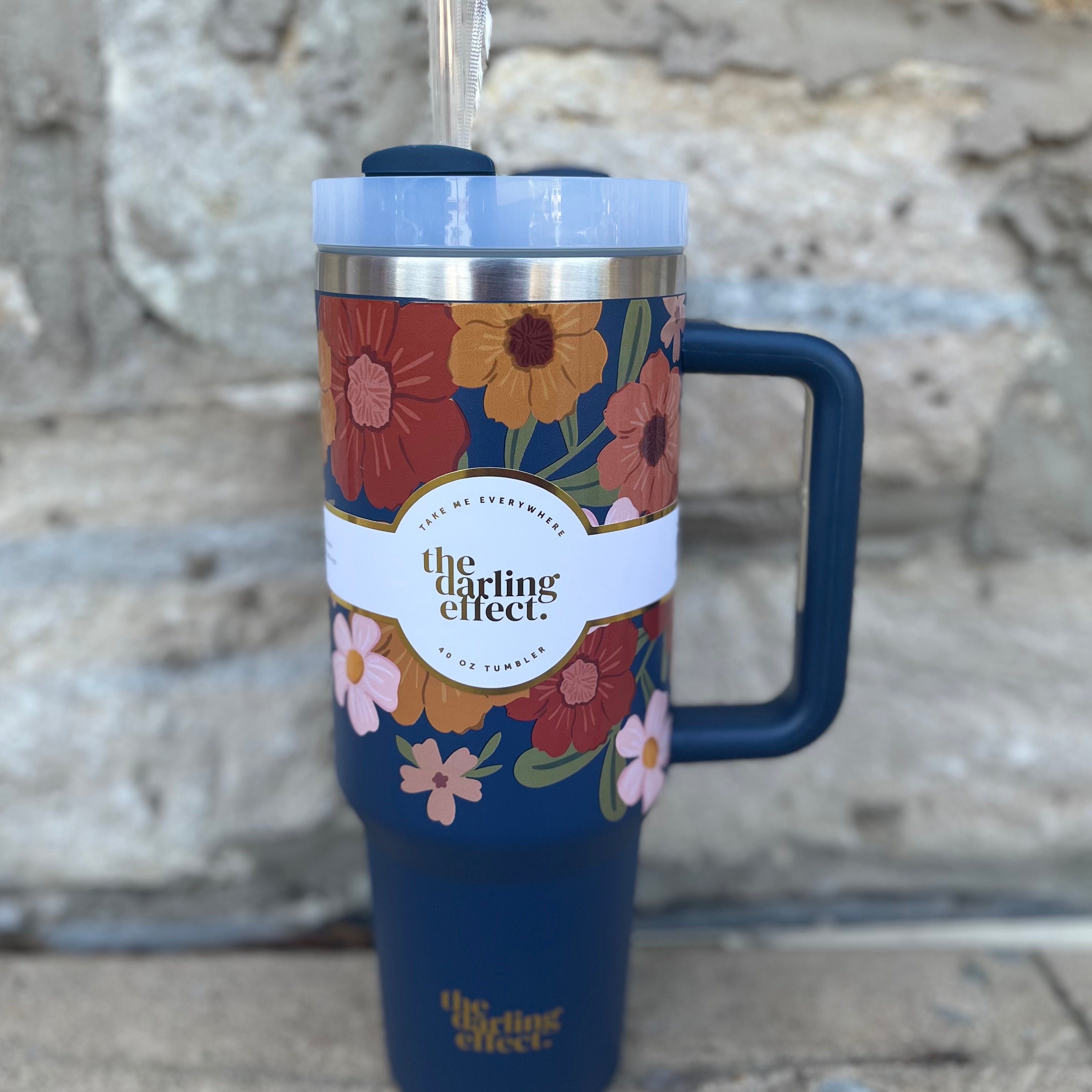Stay hydrated in style! Our 40oz tumblers keep your drinks ice-cold or piping hot all day long, perfect for busy mornings, errands, or long workdays. Featuring a sturdy handle, spill-resistant lid, and sleek design, it’s the ultimate everyday essential. Available in multiple colors to match your vibe, these tumblers make the cutest gift or treat for yourself! This hot new trendy drinkware style holds up to 40 oz. of your favorite beverage!