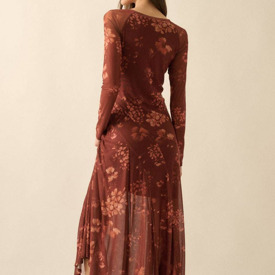 Garnet Bloom Floral Mesh Asymmetrical Midi Dress