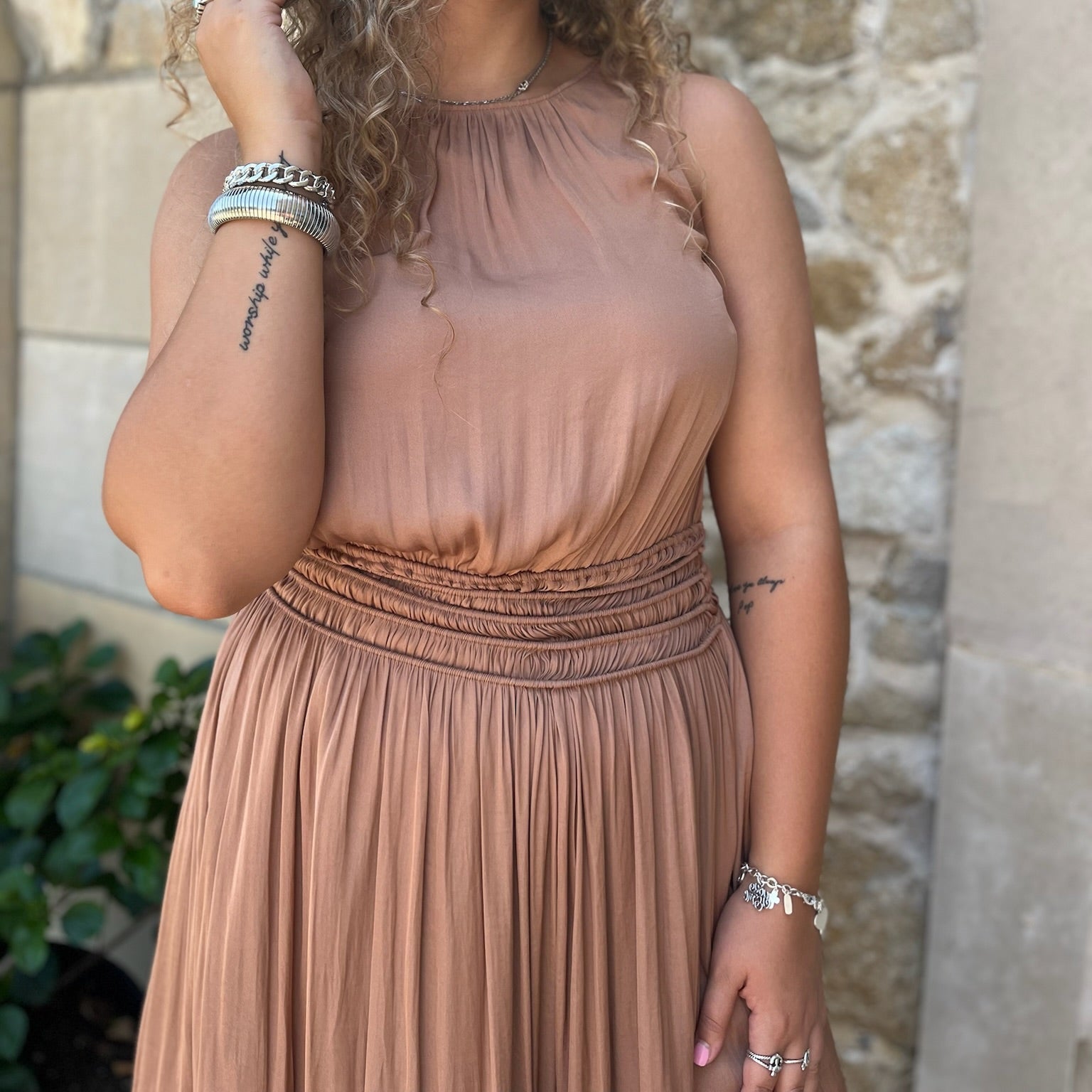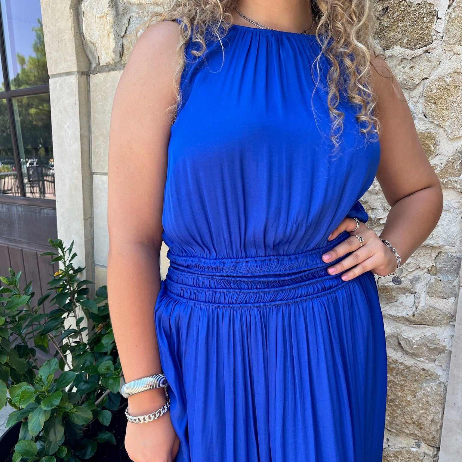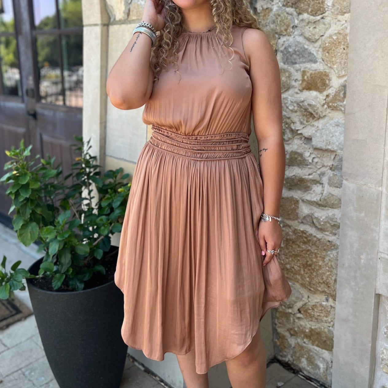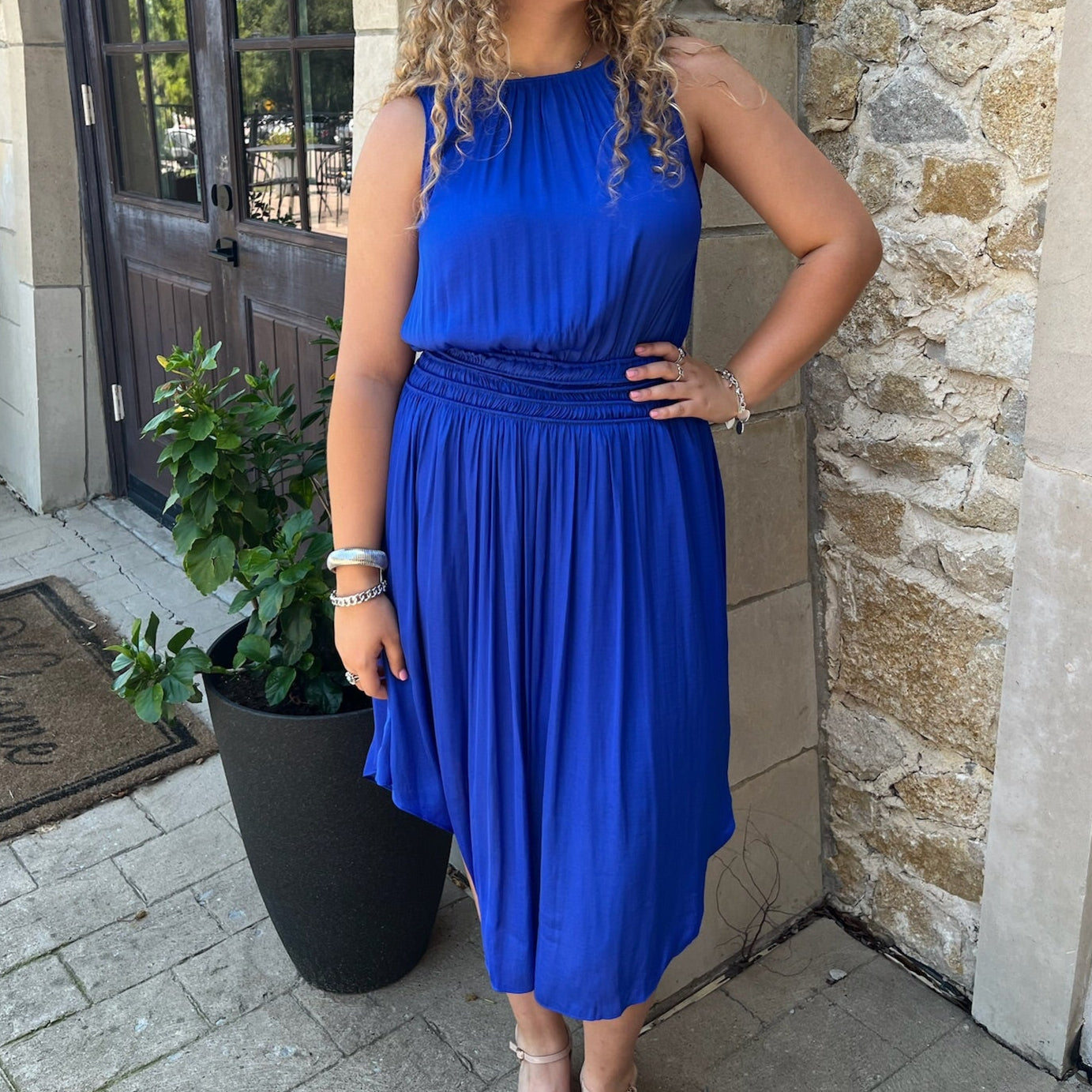 - Breezy, feminine, and effortlessly stylish — this flared midi dress is made for days when comfort meets elegance. The smocked waist cinches just right for a flattering silhouette, while the hi-low hem adds a modern, graceful touch. A keyhole button closure at the back finishes the look with understated charm. Whether you're heading to a casual gathering or a weekend outing, this dress brings ease and beauty to any moment.