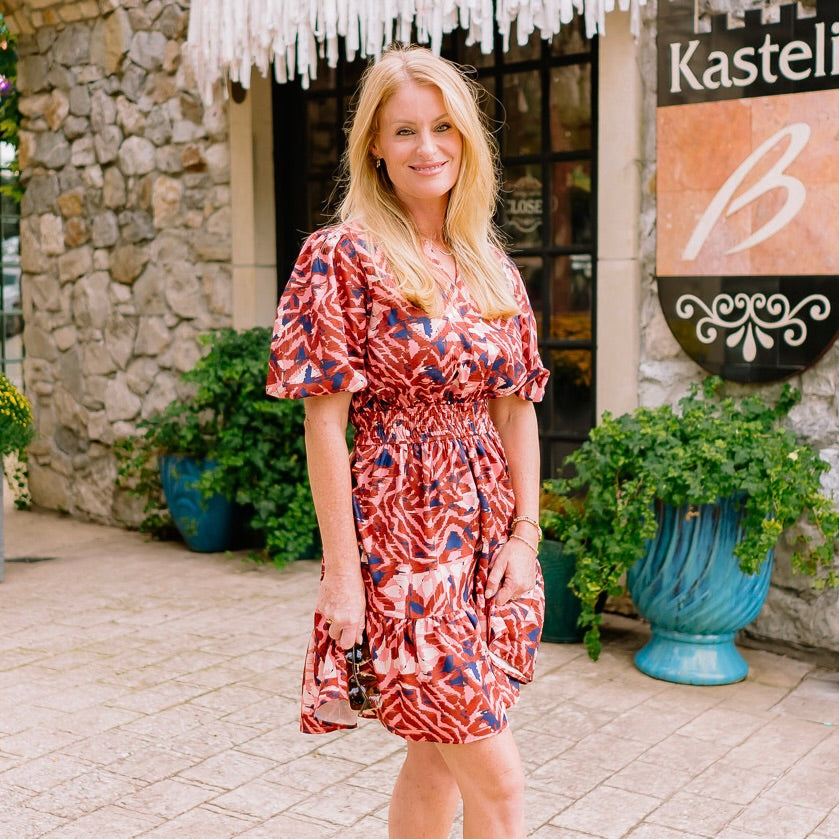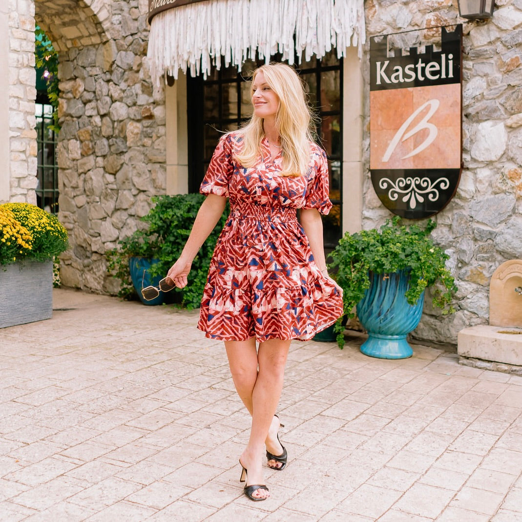 Bring rich fall vibes to life with this gorgeous multicolor mini dress in warm brown and navy tones. Designed with a flattering cinched waist, playful ruffled hemline, and feminine puff sleeves, it’s the perfect mix of chic and fun. Whether you’re headed to a fall wedding, a cozy dinner date, or just want to turn heads at your next outing, this dress makes a statement. Pair it with boots or heels to create a look that’s effortlessly seasonal and undeniably stunning.