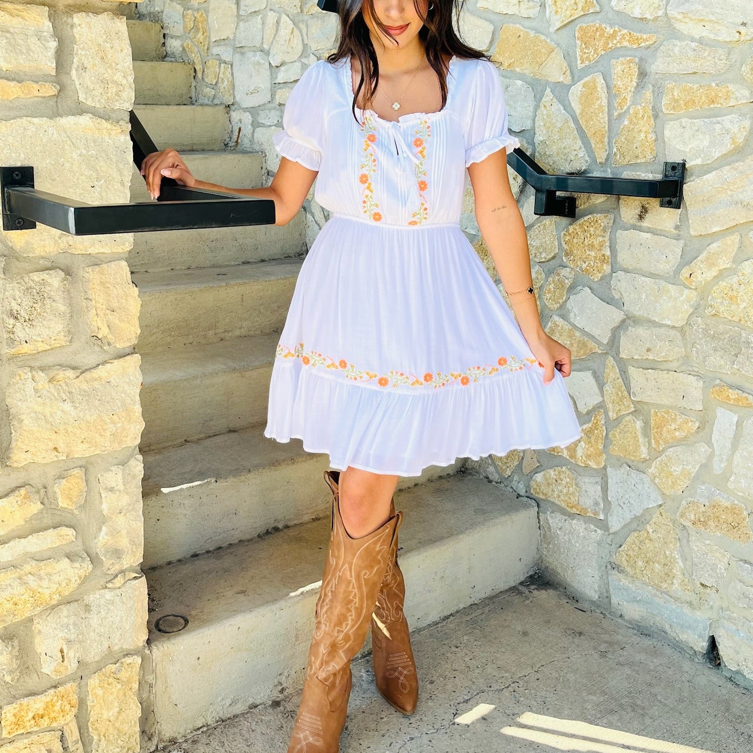 Floral everything for this summer please! This sweet little dress is a great addition to your closet! The floral embroidery adds a fun flair to a simple mini dress. A great piece to dress up or down, and so versatile for so many ocassions!