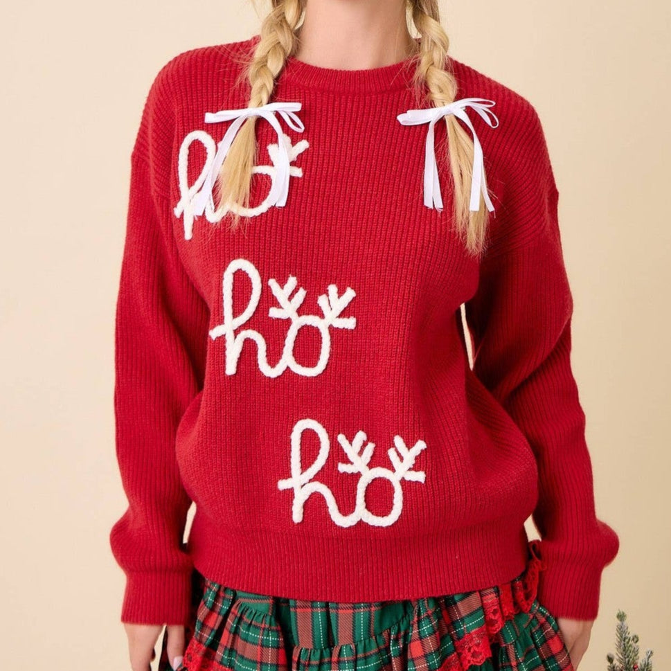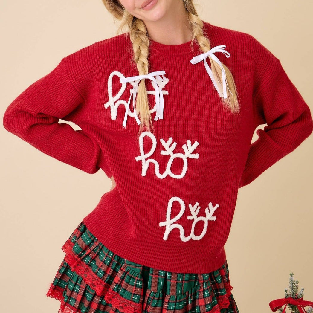 Bring the jolly wherever you go in this too-cute-to-be-coal-worthy red sweater! Featuring thick cozy knit, classic crew neckline, and playful white embroidery that reads “ho, ho, ho” with tiny reindeer antlers above the o’s - it’s festive fun wrapped up in one adorable look. Perfect for holiday parties, casual workdays, or cozy nights by the tree. Makes a cheerful gift or just a merry little treat for yourself!