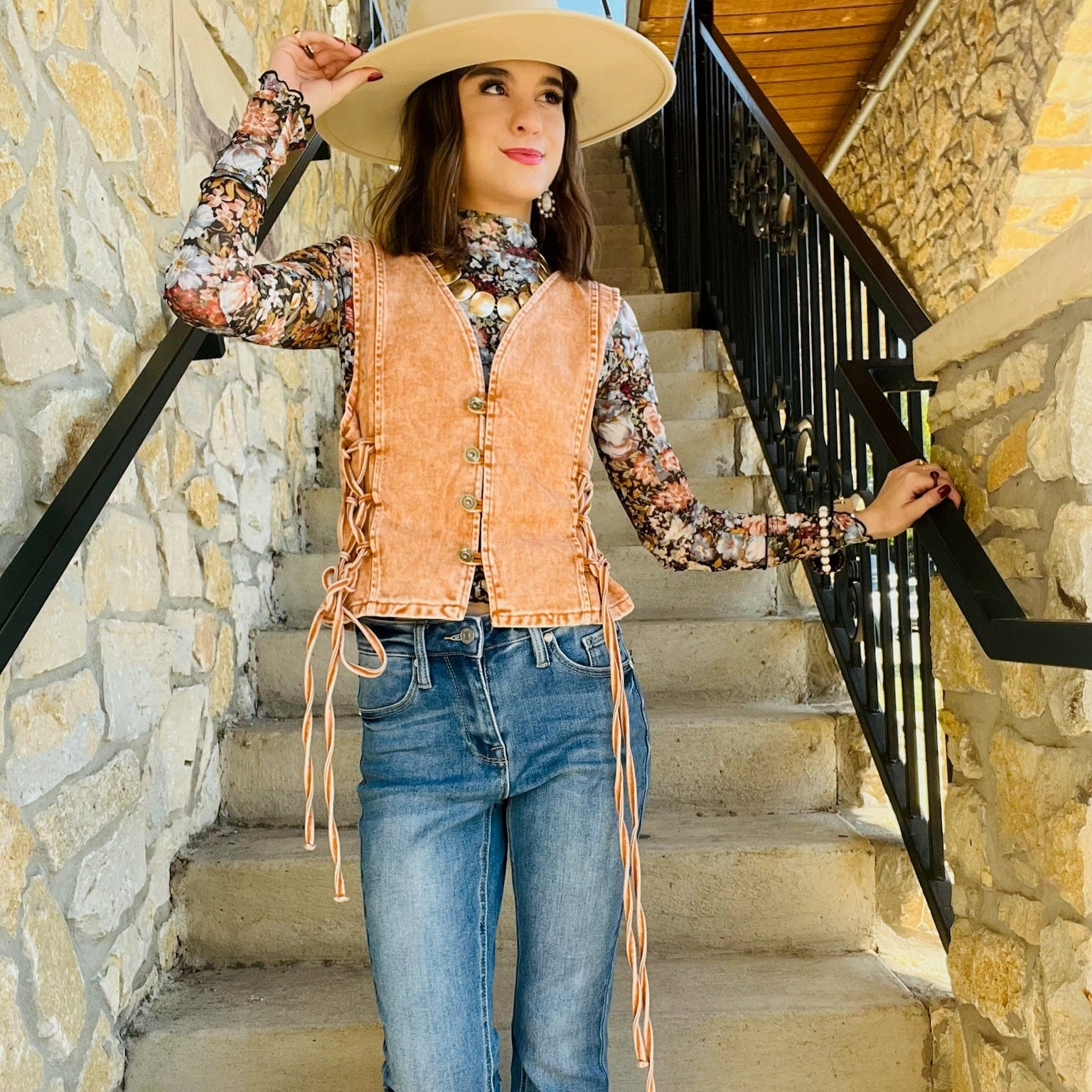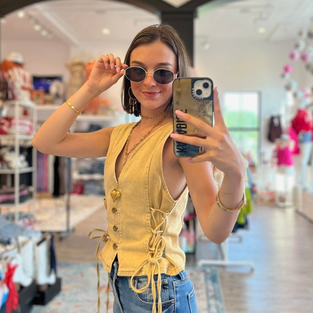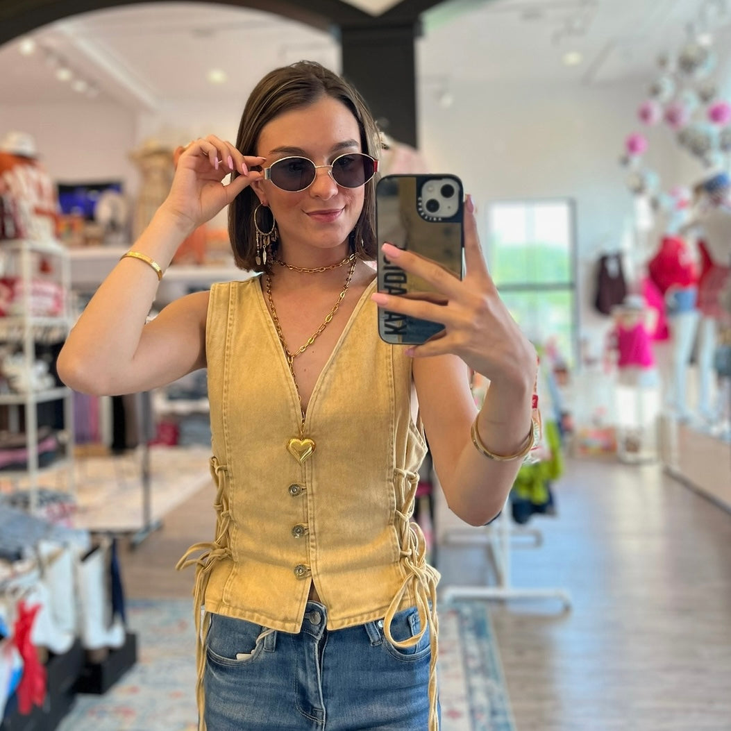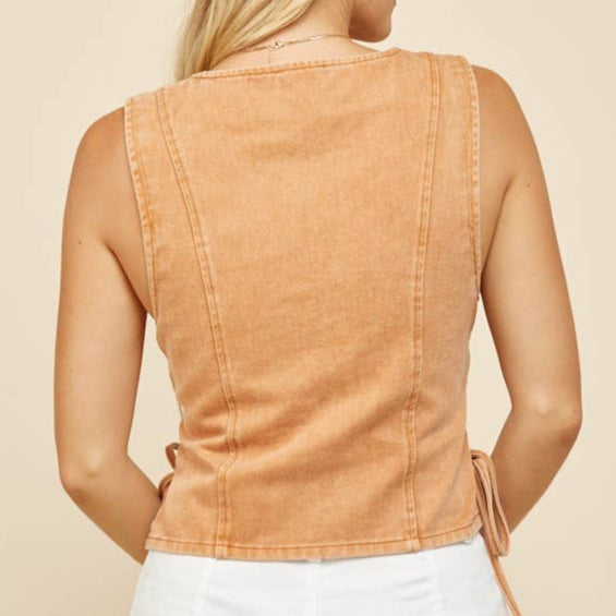 - This denim vest is the ultimate boho-western statement piece. Designed with a flattering v-neckline, button-up front, and lace-up sides, it blends structure with free-spirited flair. Whether you're layering it over a tee for cooler weather or rocking it solo with a maxi skirt for summer festivals, it's a versatile piece made for concerts, rodeos, photoshoots, and everything in between. Available in rich rust and soft tan, this sleeveless vest brings a bold yet wearable edge to any outfit. From summer to fall, it's your go-to for western chic done right.