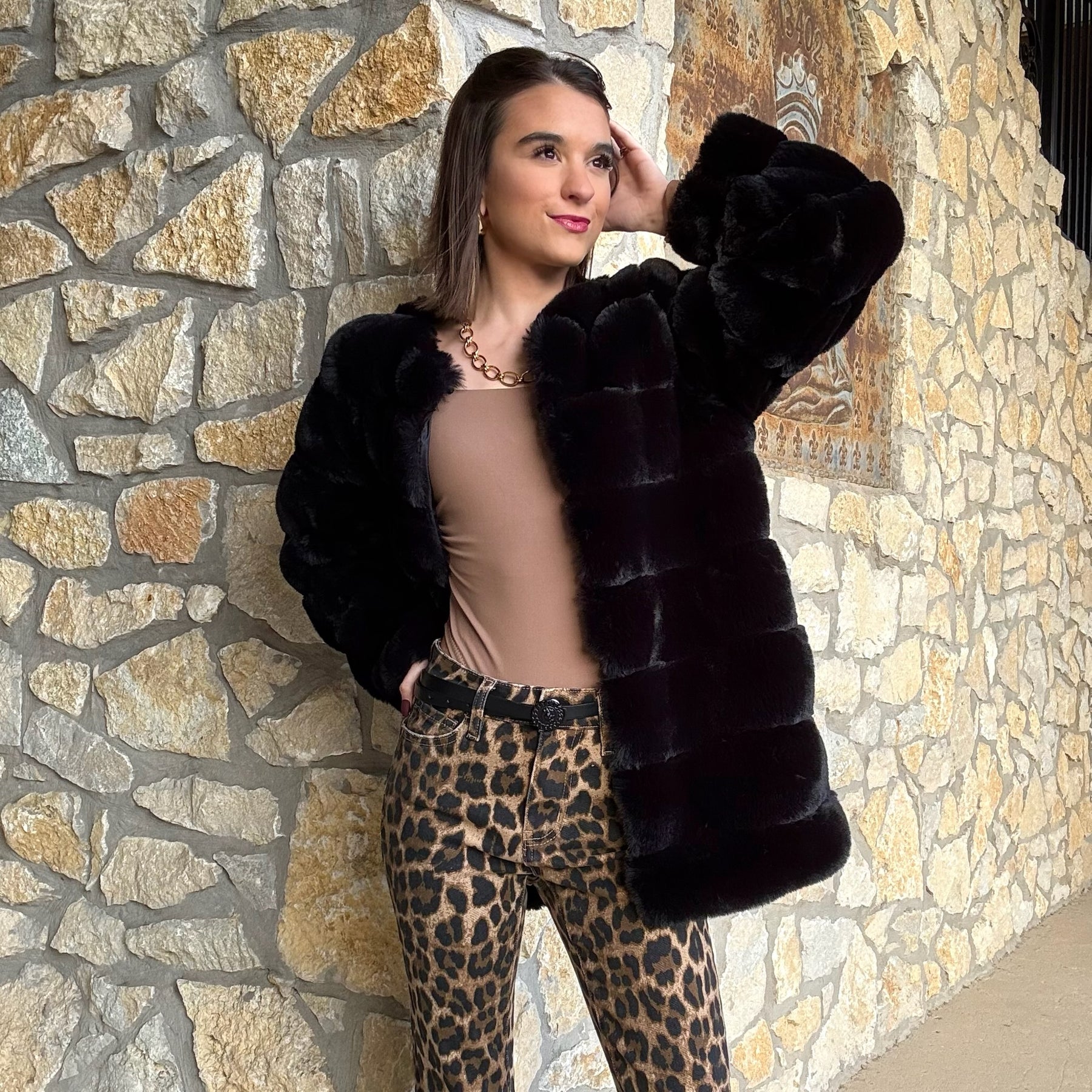 • Cozy meets chic in this stunning black faux fur coat. The no-collar neckline and puffed texture create a stylish, modern look, while the shorter length makes it easy to throw on over any outfit. Fully lined and ultra-soft, it’s your new go-to for nights out, holiday events, and everyday glam.