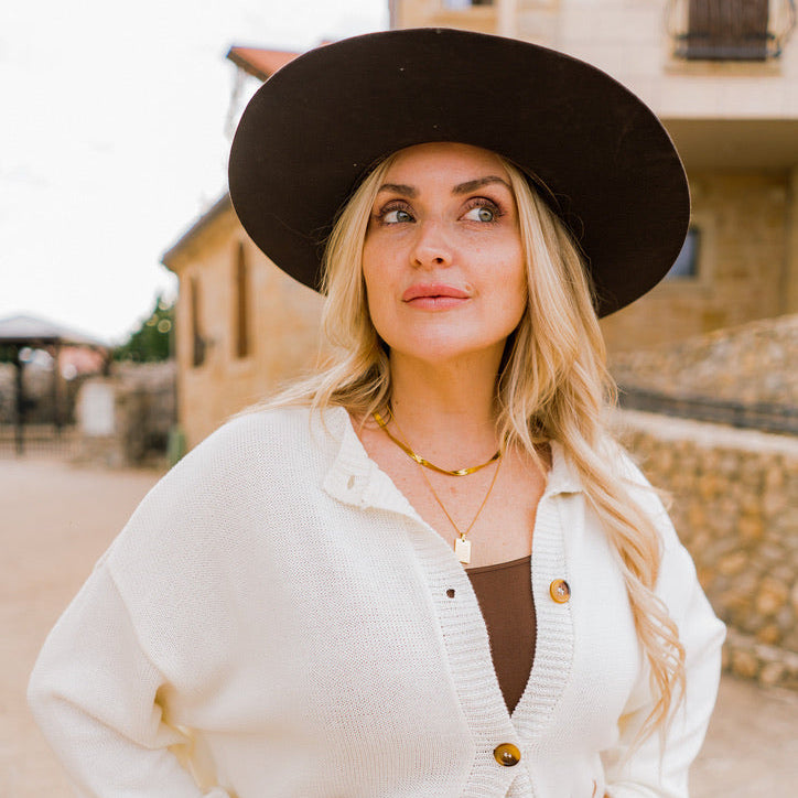 Top off your look with timeless western flair. These wide-brim hats bring the perfect mix of boho chic and rugged edge, making them a standout accessory for fall and winter. Whether styled with a flowy dress and boots, denim and a sweater, or layered with a fur coat for the holidays, they instantly elevate any outfit. The custom band detail adds a unique touch, while the stiff brim and triangle crown keep the shape sharp and stylish. A versatile must-have for concerts, game days, or simply adding a little western chic to your everyday look.