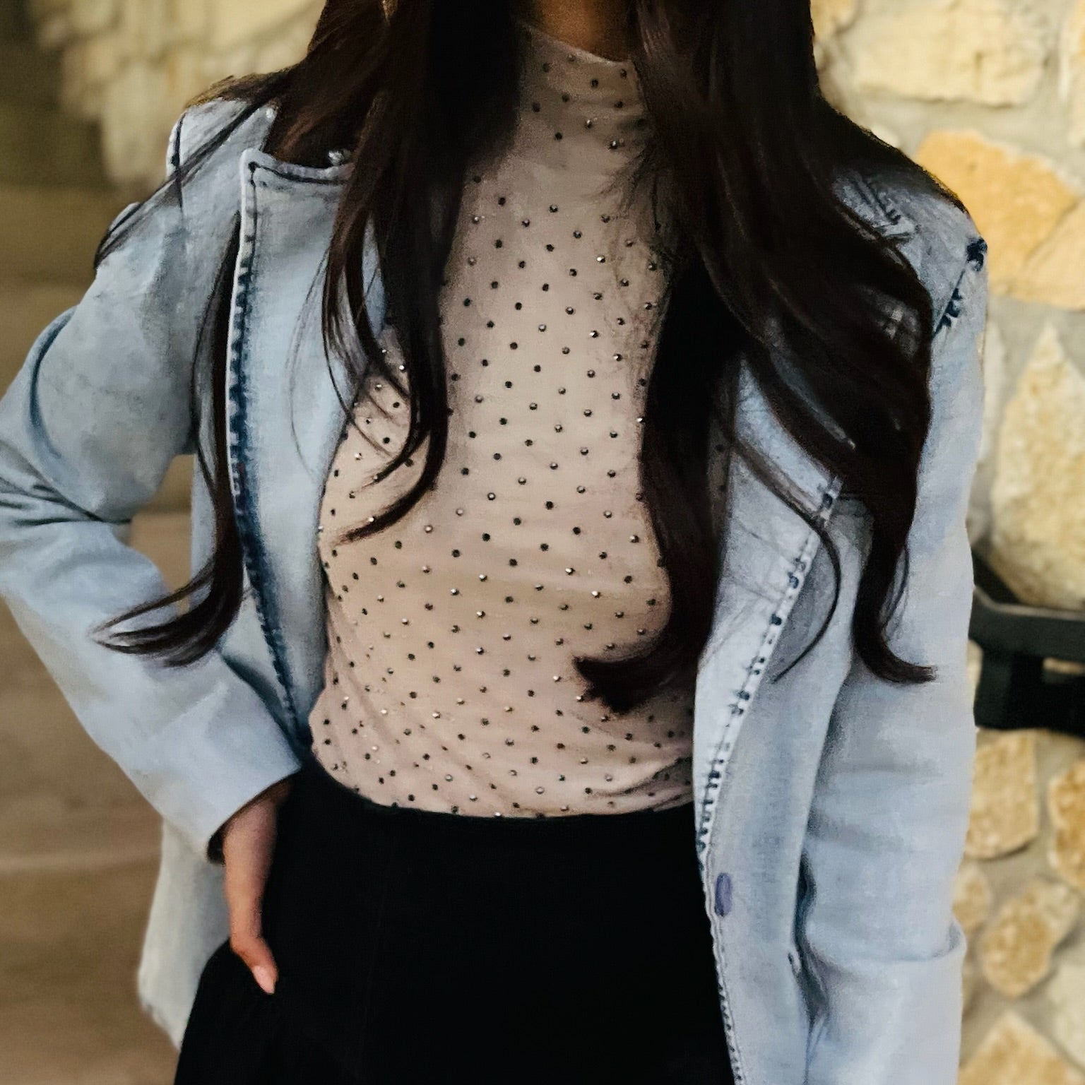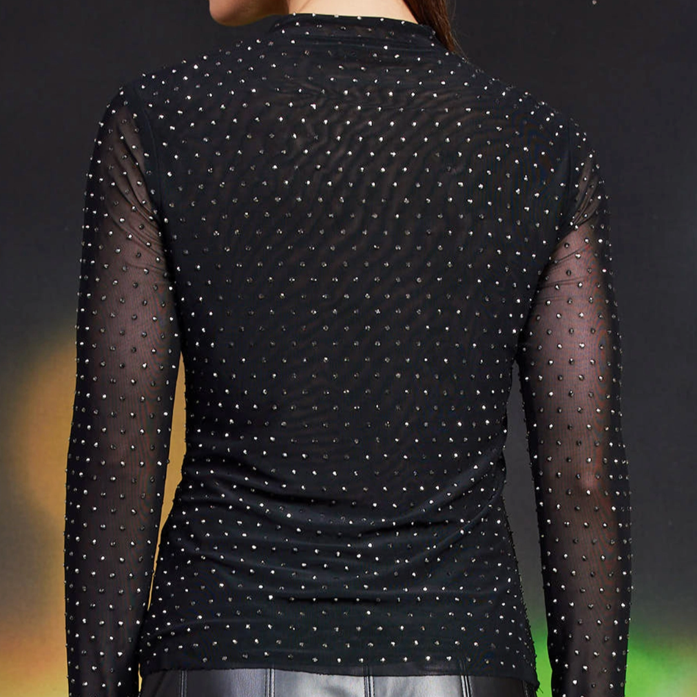 embellished mock neck top, sheer sleeve top, mesh long sleeve blouse, holiday party top, date night top, going out top for women, chic embellished top, glamorous evening top, lightweight dressy top, embellished mesh top, mock neck blouse women, green mock neck top, black embellished top, taupe mesh top, sparkly long sleeve top, layering tops for winter, dressy tops for jeans, clubwear tops women, sophisticated sexy top, semi sheer sleeve top, women's holiday outfit top, boutique evening top, embellished top