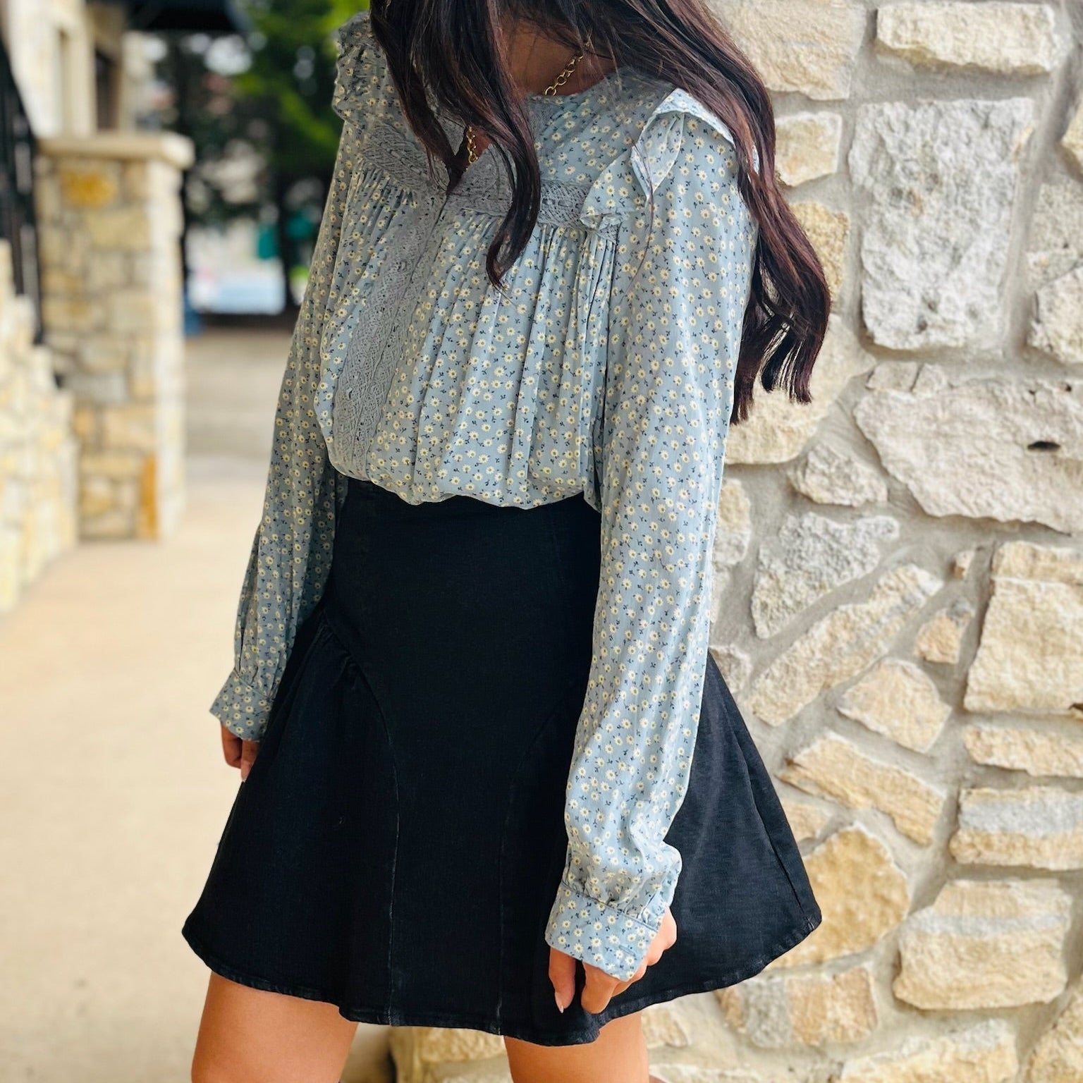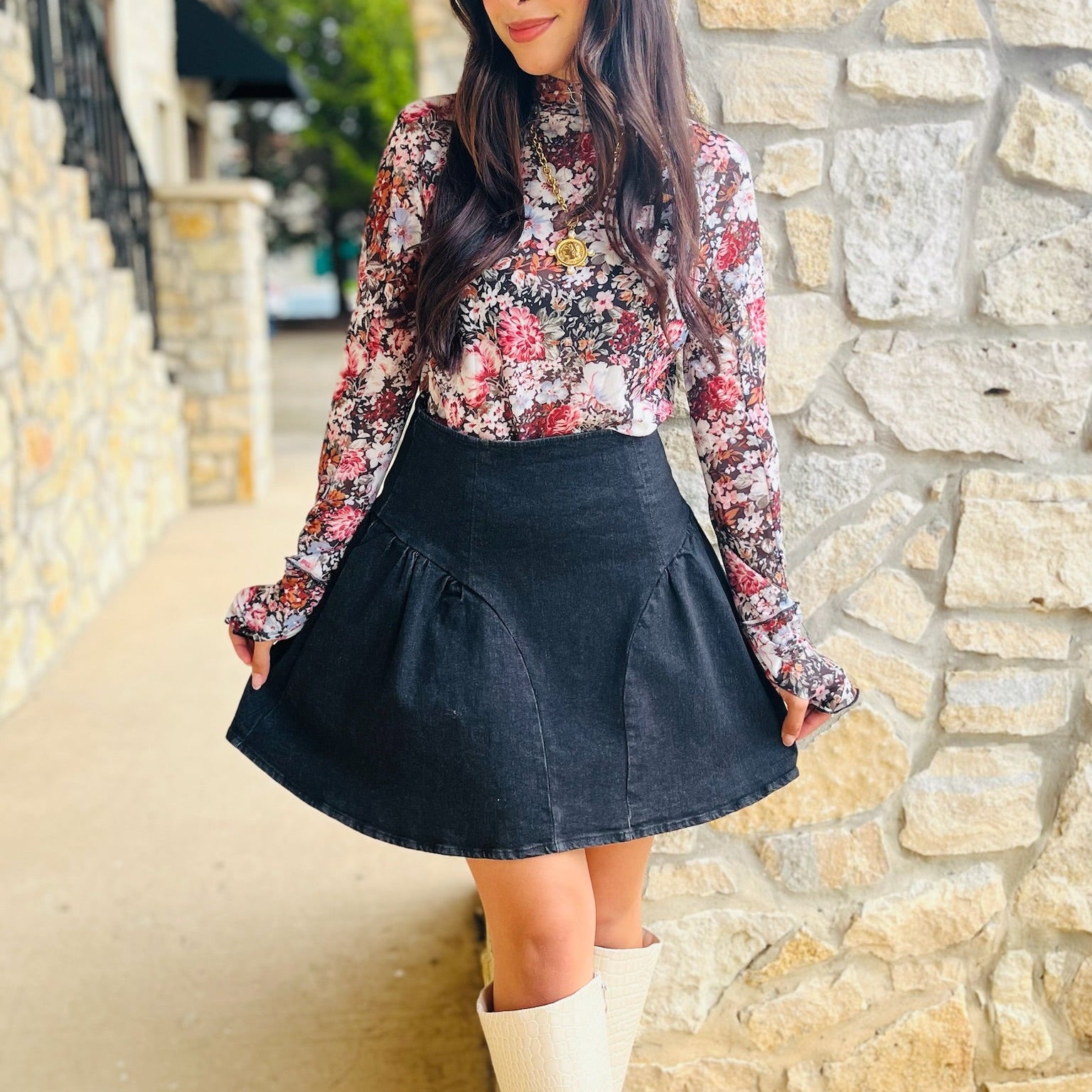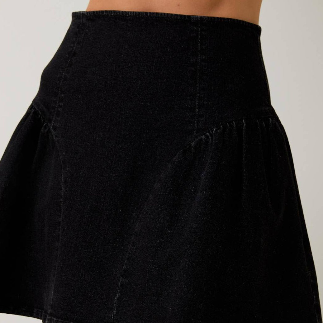 black flare mini skirt, black denim mini skirt, flared mini skirt, stretchy mini skirt, black skirt for all seasons, versatile mini skirt, year-round skirt, fall mini skirt, winter mini skirt, spring mini skirt, summer mini skirt, mini skirt with back zipper, casual black skirt, dressy black mini skirt, comfortable denim skirt, black skirt with stretch, soft denim mini skirt, high waist mini skirt, game day skirt, transitional mini skirt, wardrobe staple skirt, everyday black skirt, flattering mini skirt