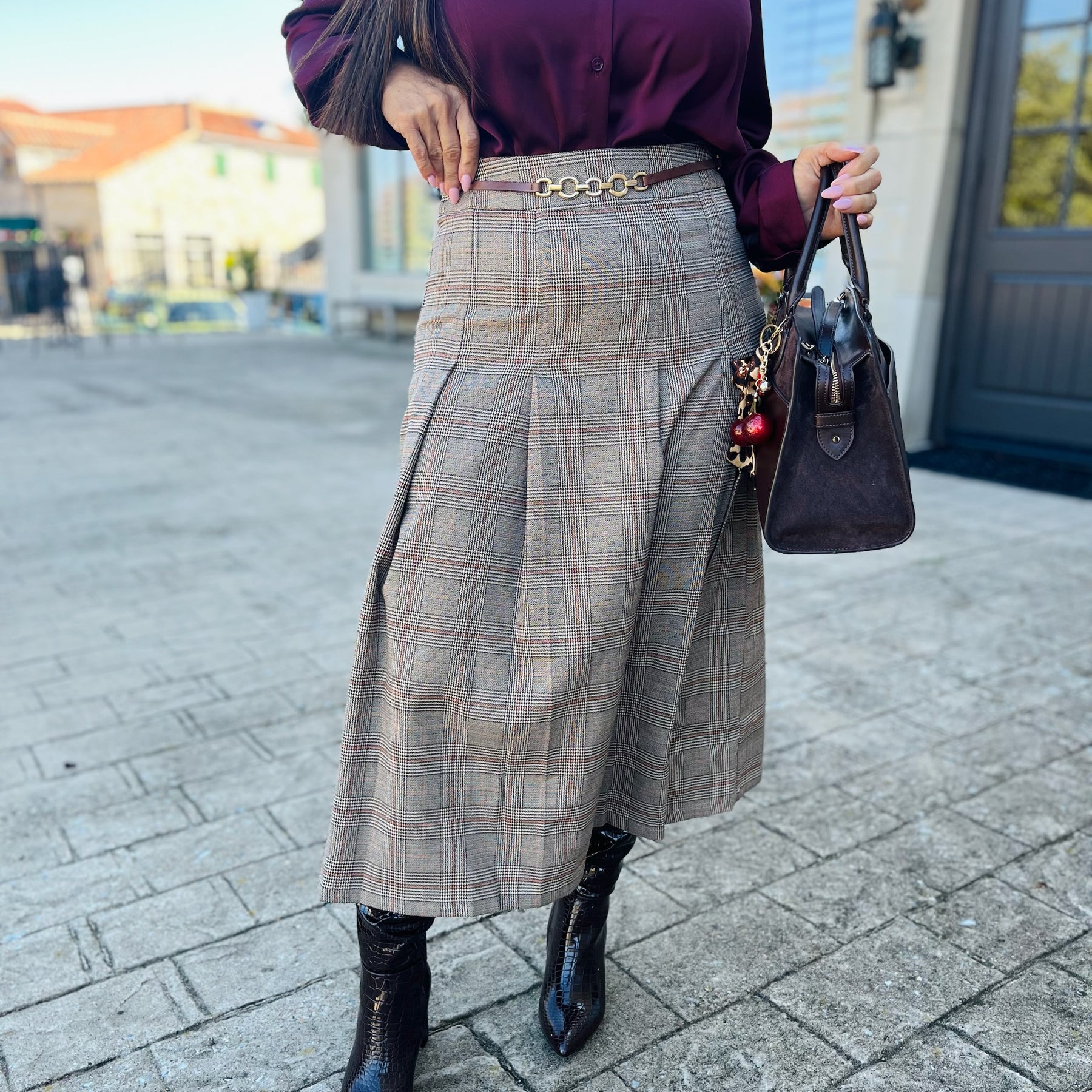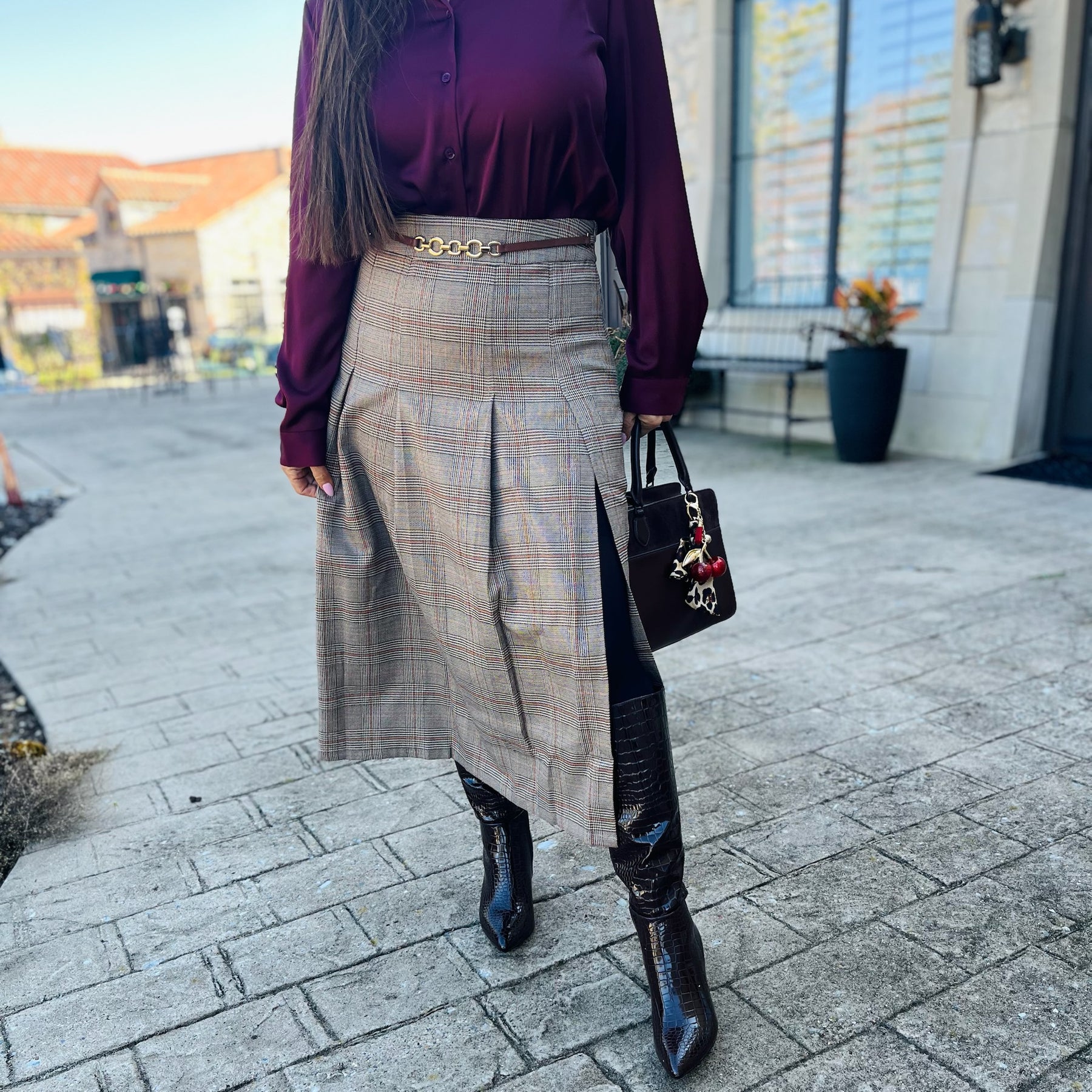 Meet your new main character skirt - this plaid pleated midi is equal parts chic and bold. Designed in neutral tones that pair with anything, it features flattering front and back pleats and a daring high side slit that adds just the right touch of edge. The attached belt and tailored fit give it a structured, elevated feel, while the woven fabric keeps it timeless. Style it with a fitted turtleneck and boots for a fall night out, or a sleek bodysuit and heels for date night. Wherever you wear it, this skirt guarantees all eyes on you.