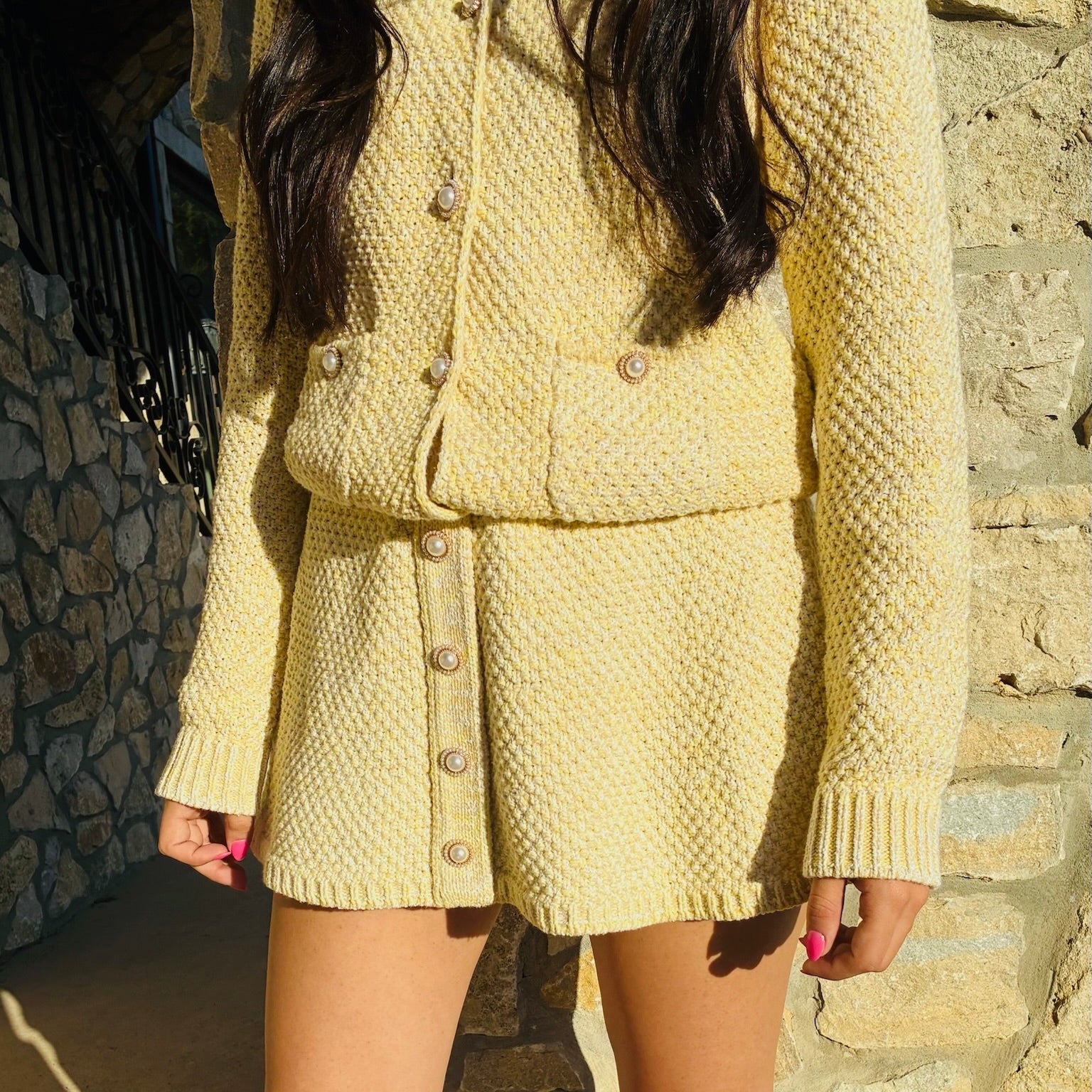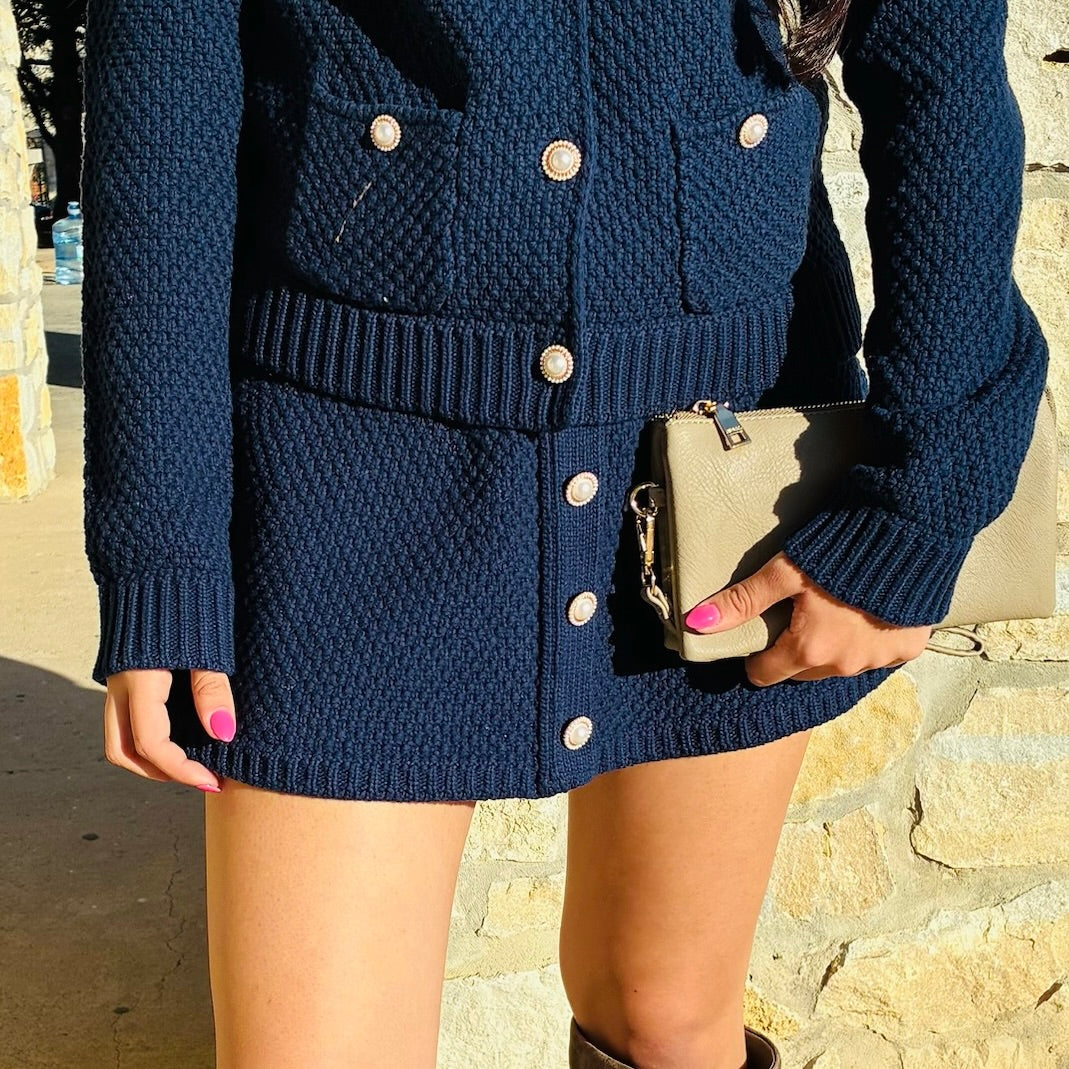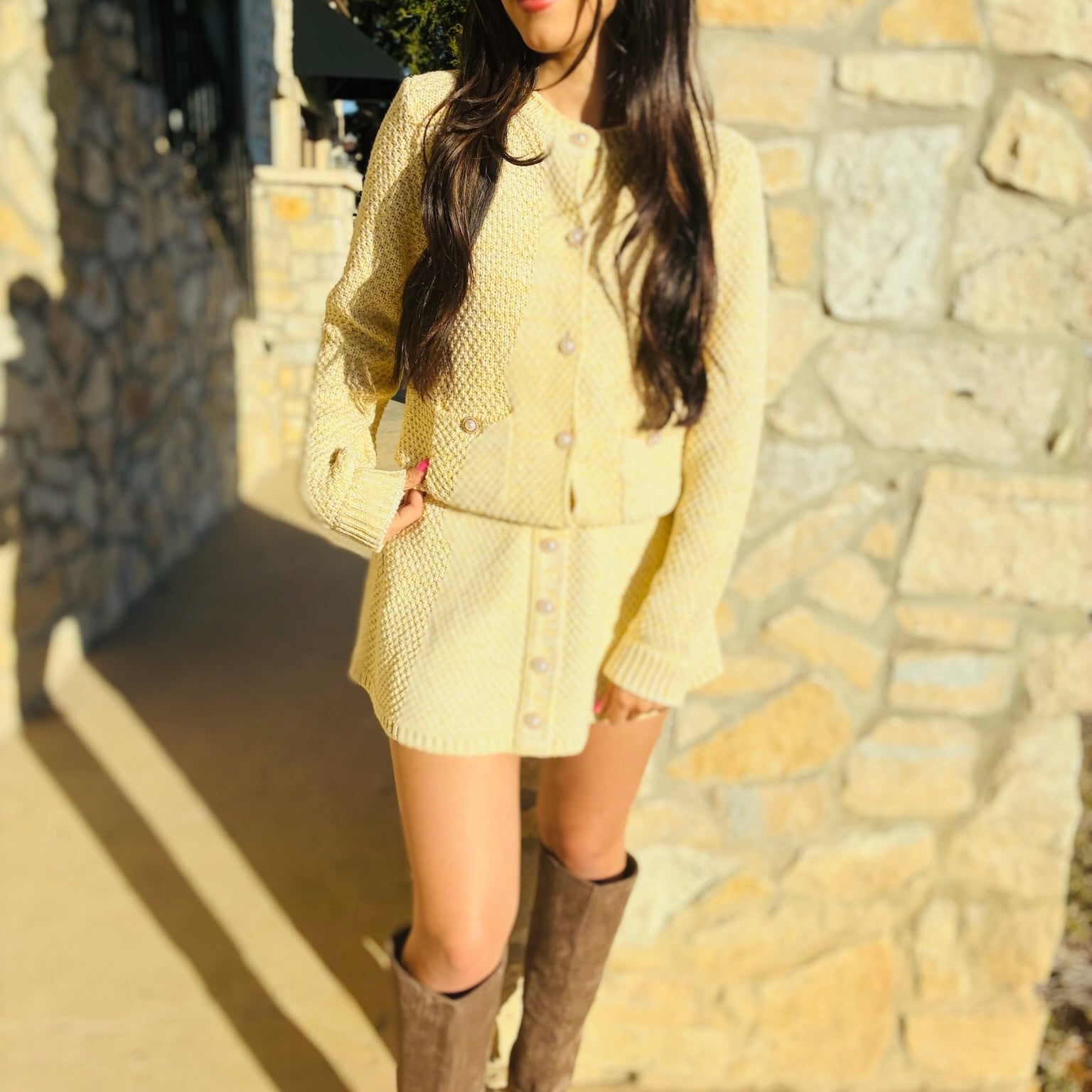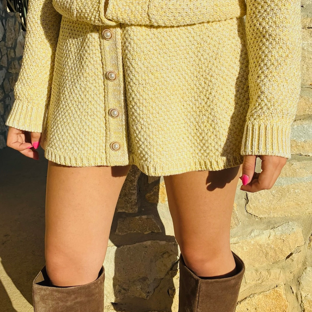 Designed to perfectly complement its matching cardigan, this pearl-button skirt features a textured knit and classic silhouette for a polished, feminine look. Effortlessly chic and easy to style, it’s perfect for dressy occasions or elevated everyday wear!
