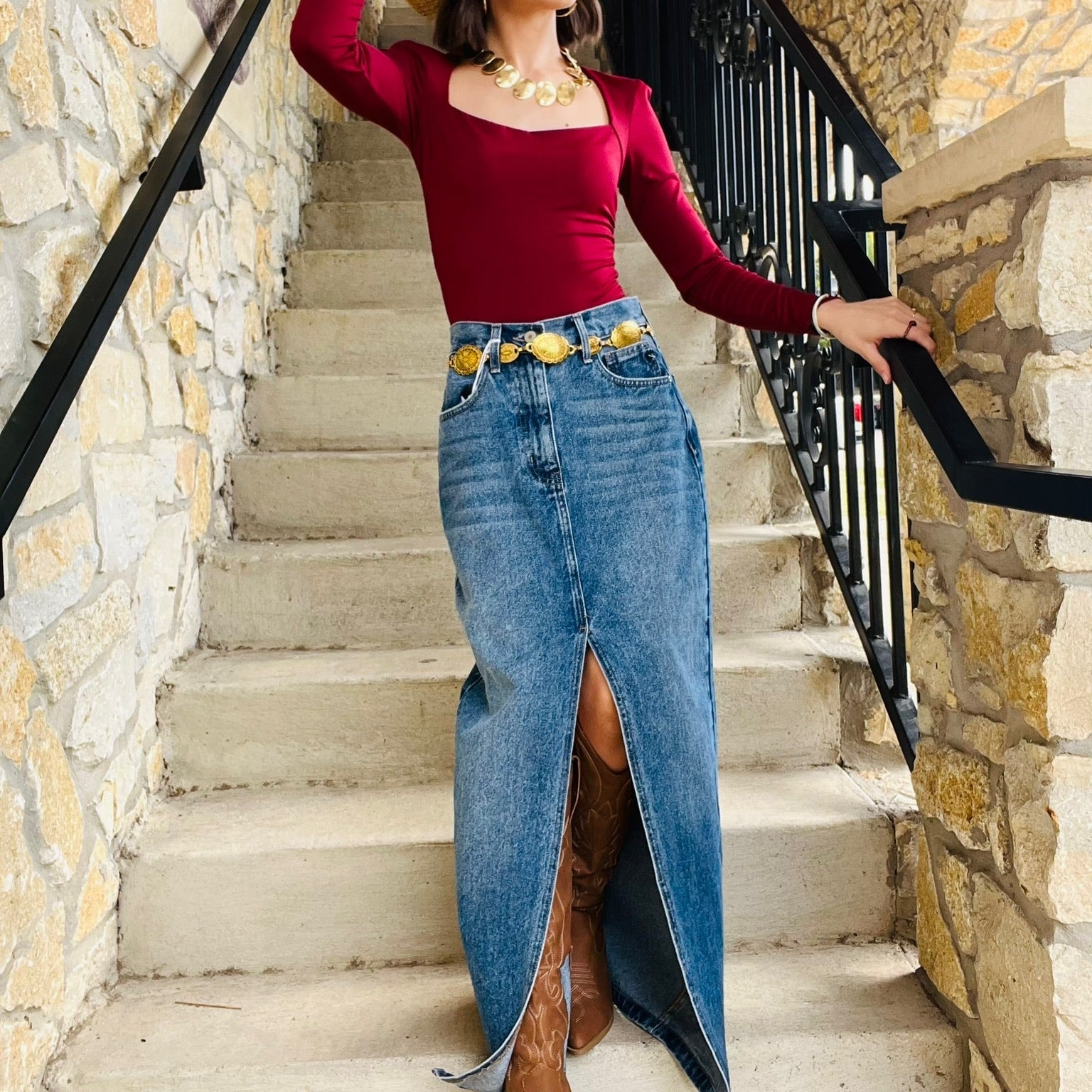 - The denim midi skirt is back - and this one is your new go-to for every season. The midi length gives just the right amount of coverage for cooler days, while the center slit keeps it breezy and easy to style year-round. From holiday gatherings and concerts to game days, coffee runs, brunch, or nights out with the girls, this skirt transitions seamlessly from casual to chic. Crafted in bestselling KanCan denim, it’s a timeless piece that pairs perfectly with boots, sneakers, or heels - making it a closet staple you’ll wear on repeat.