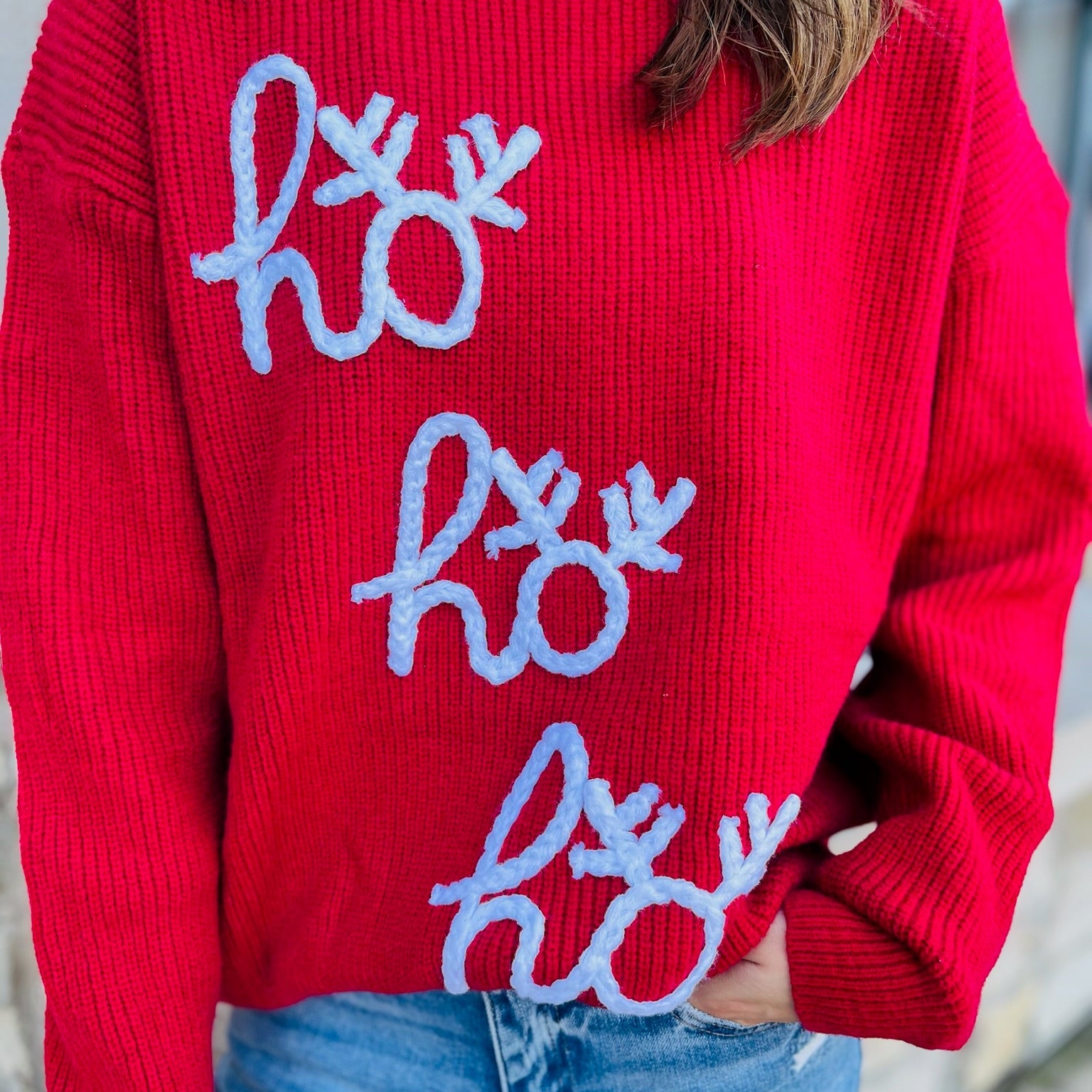 Bring the jolly wherever you go in this too-cute-to-be-coal-worthy red sweater! Featuring thick cozy knit, classic crew neckline, and playful white embroidery that reads “ho, ho, ho” with tiny reindeer antlers above the o’s - it’s festive fun wrapped up in one adorable look. Perfect for holiday parties, casual workdays, or cozy nights by the tree. Makes a cheerful gift or just a merry little treat for yourself!