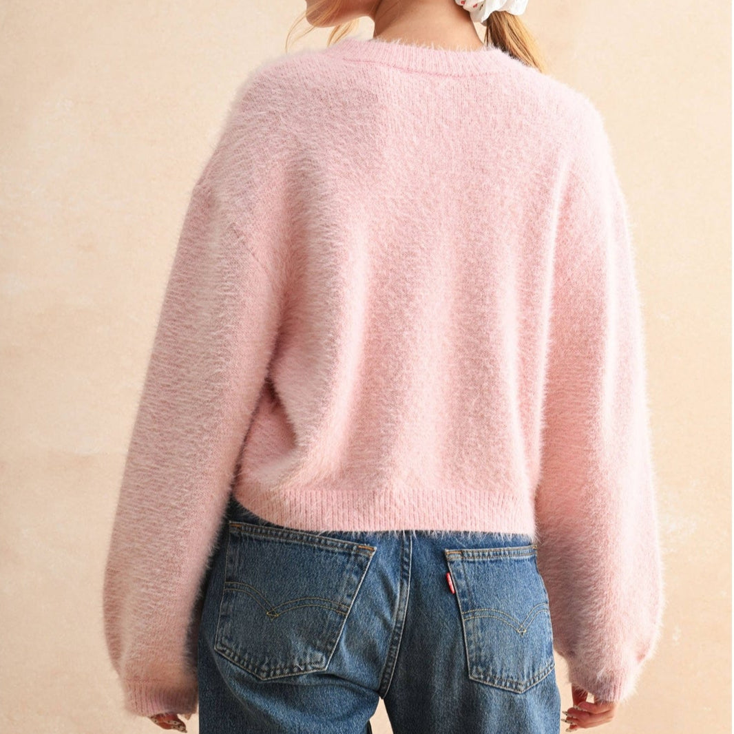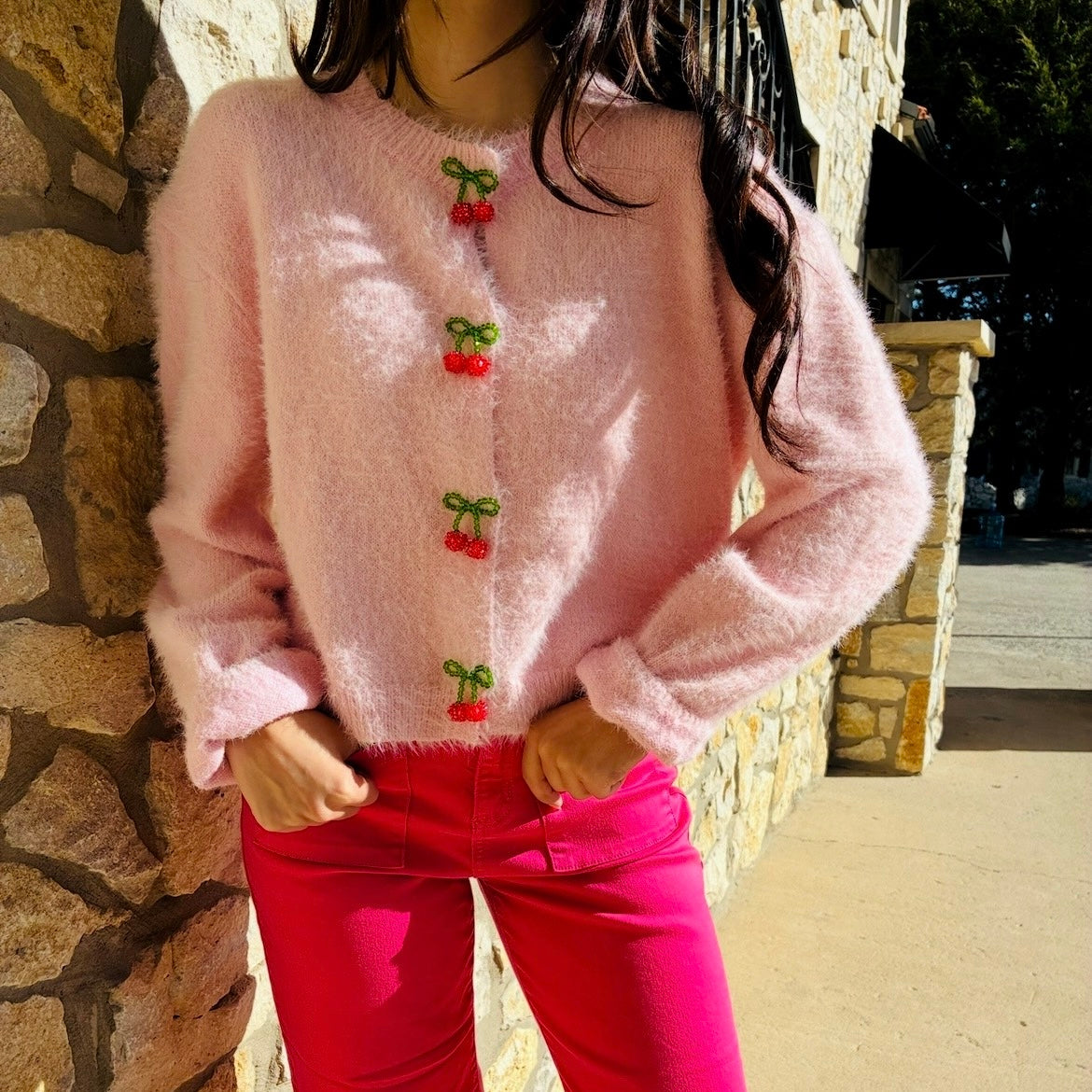 - This light pink fuzzy cardigan is everything we love—cozy, playful, and full of charm. Finished with the cutest cherry-shaped buttons, it's a fun twist on a classic button-up style. Whether you're dressing it up with a mini skirt or throwing it on over your comfiest denim, this cardigan brings the sweet to any outfit.