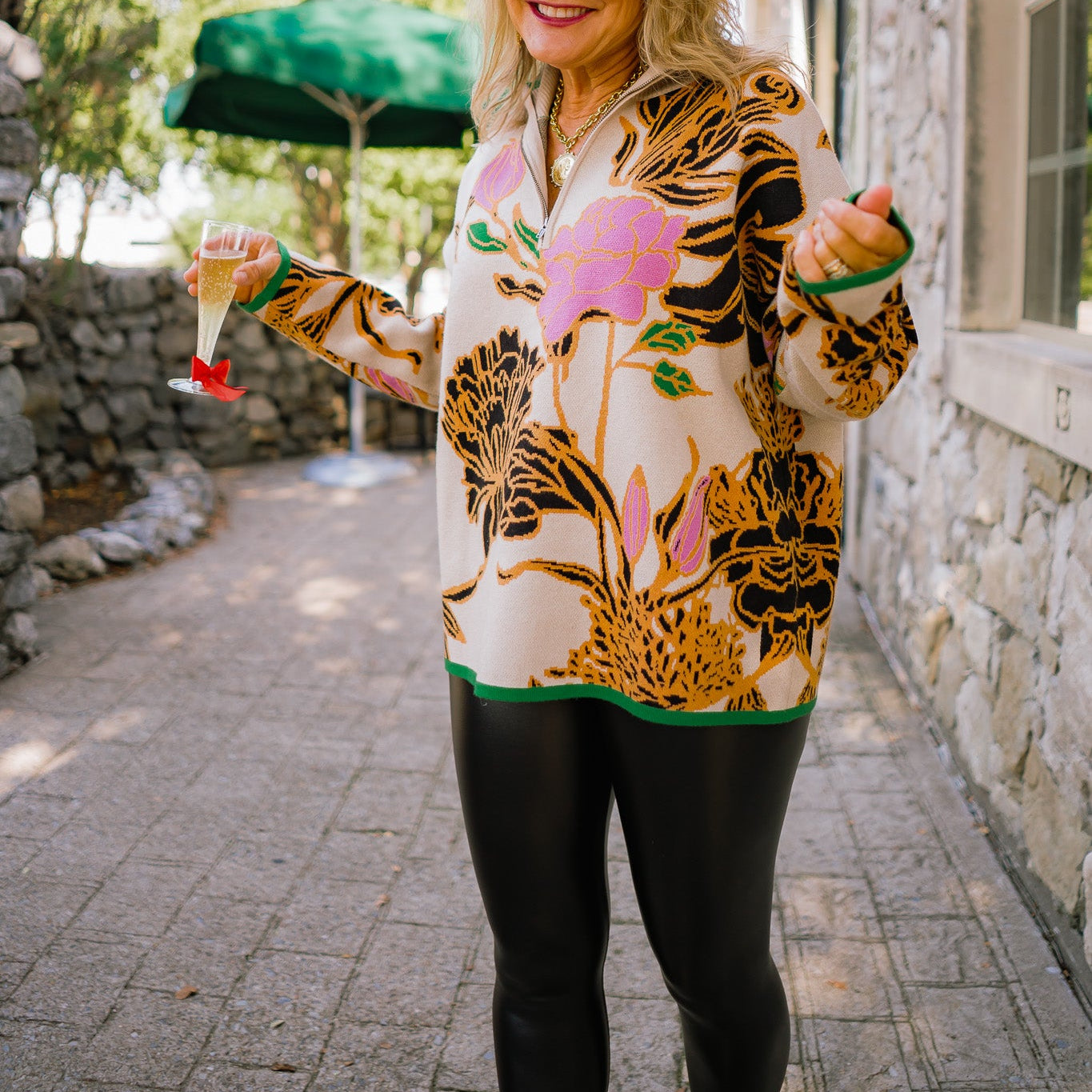 Bold meets cozy in this eye-catching floral pullover sweater. Featuring an oversized botanical pattern in rich shades of black, burnt orange, and soft pink on a warm beige base, this statement piece brings a modern twist to a classic silhouette. The high mock neck with a half-zip detail adds a sporty edge, while vibrant green ribbed trim at the cuffs, hem, and neckline provides a fresh pop of contrast. With its relaxed fit and striking design, this sweater is perfect for adding artistic flair to your fall and winter wardrobe.