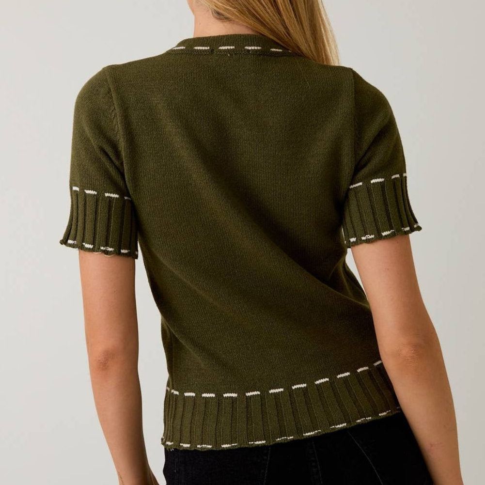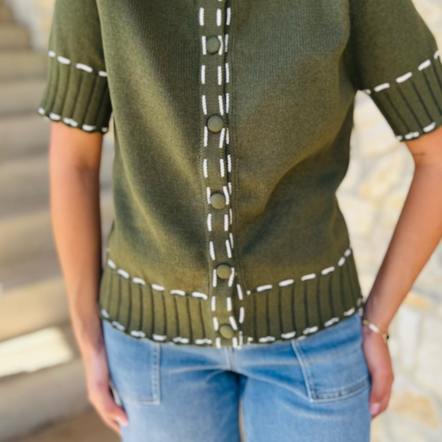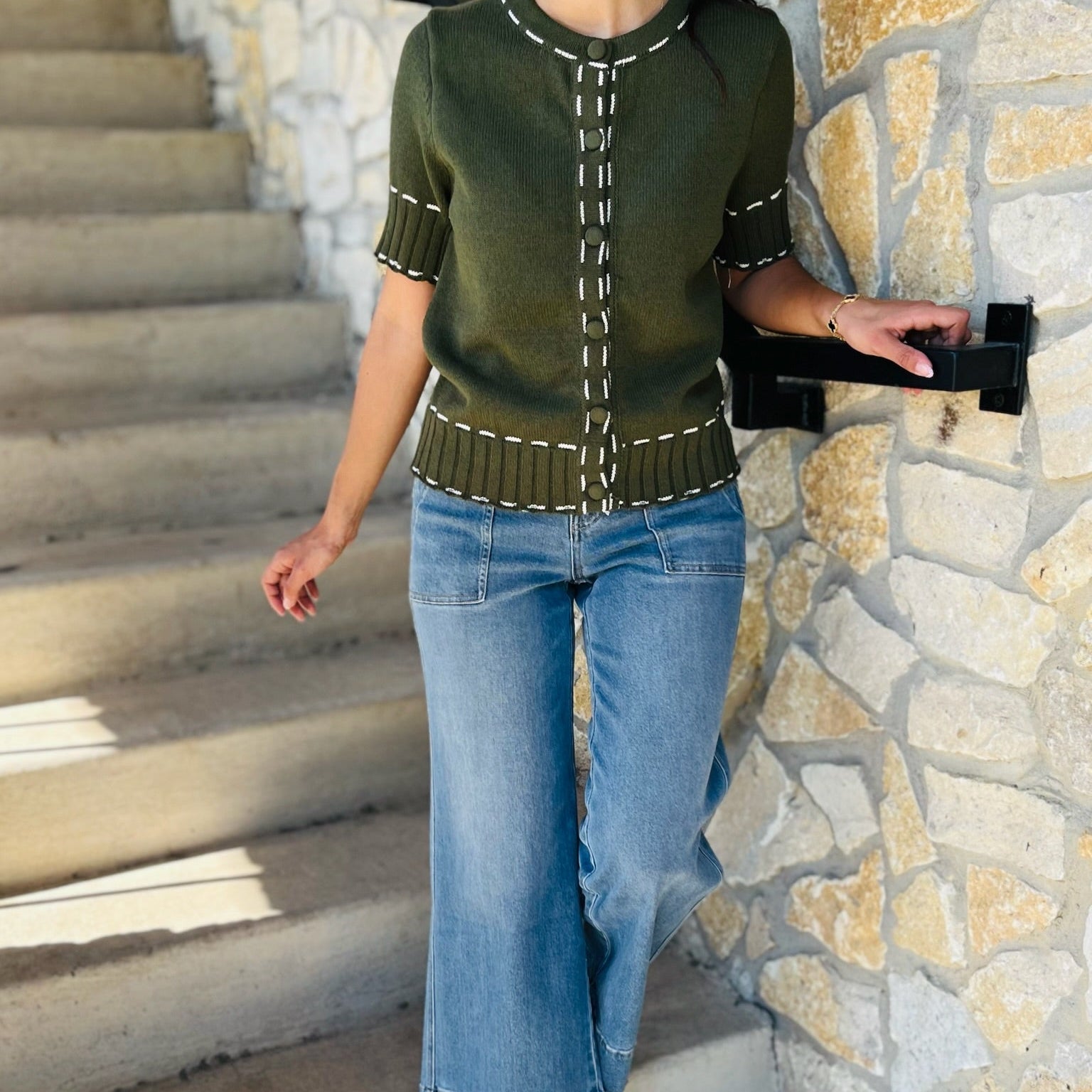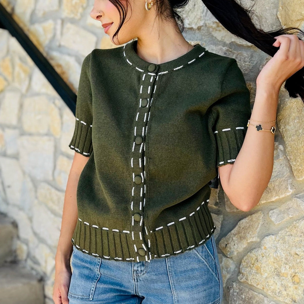 Sleek, versatile, and oh-so chic - this olive green stitch detail cardigan is the perfect blend of professional polish and everyday style. Designed with a round neckline, short sleeves, and textured hem for added dimension, it’s a timeless layering piece that transitions seamlessly from business casual looks to weekend wear. Pair it with tailored trousers for the office or throw it over jeans for a laid-back yet refined outfit!