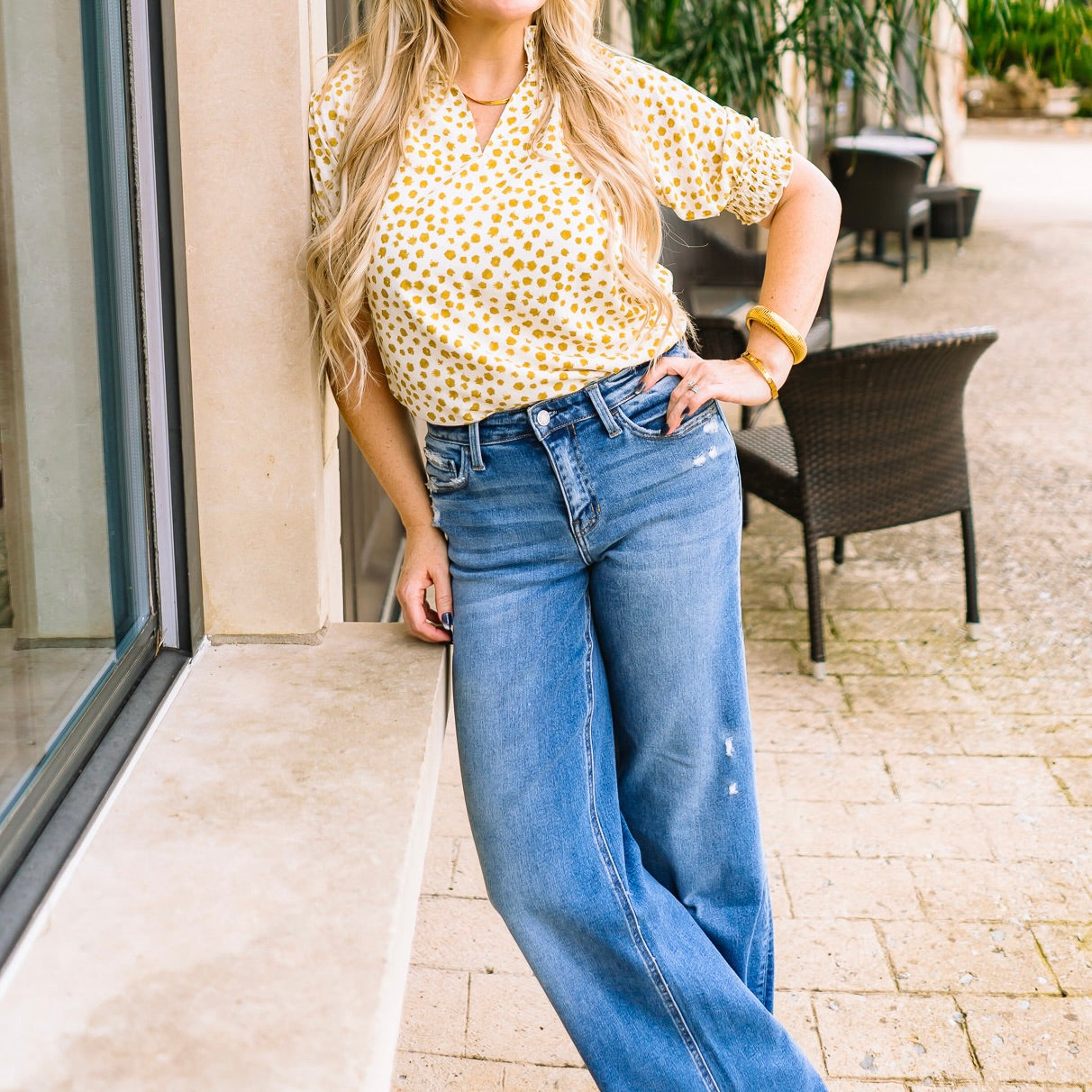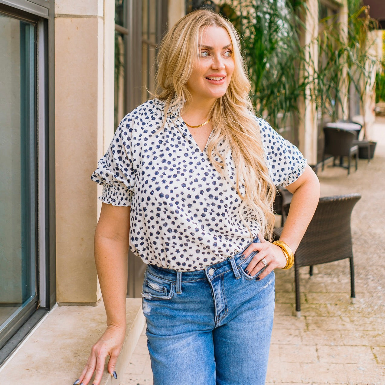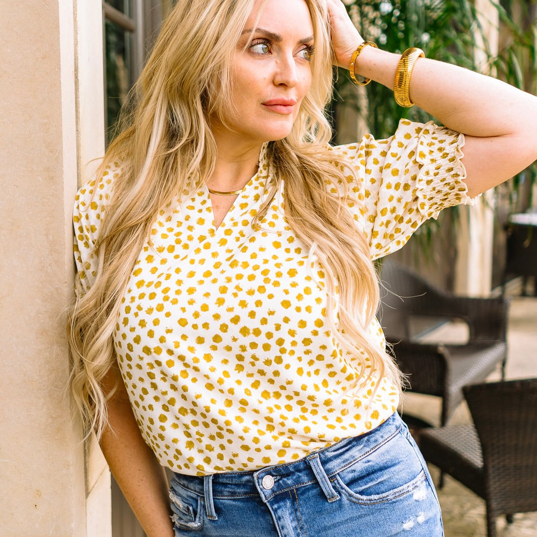 Elevate your everyday wardrobe with this timeless dotted top - simple, sophisticated, and effortlessly chic. Crafted in a lightweight jacquard fabric with a subtle dot print, it features a flattering V-neck, puff short sleeves with smocked cuffs, and a delicate smocked neckline for feminine detail. Perfect for business casual looks, weekend brunches, or paired with jeans for a polished yet relaxed outfit, this top is a versatile staple you’ll reach for again and again.