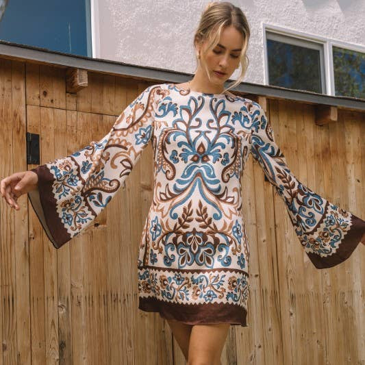 Turn heads this fall in this dress where vintage-inspired florals meet dramatic bell sleeves and a flattering, flowy silhouette. The rich earthy tones and thick brown hem stripes give it that perfect touch of retro charm, while the high neckline keeps it chic and modest. Pair it with high boots or tights and a cozy fur coat for a look that’s effortlessly stylish and season-ready.