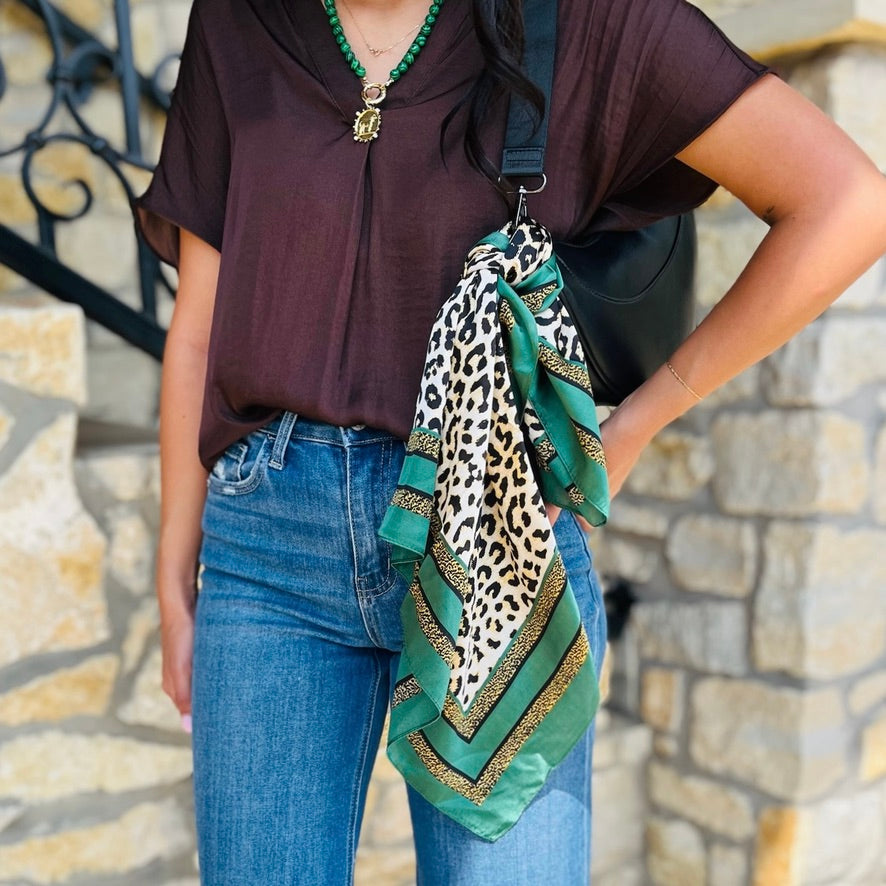 Fierce meets elegant with this emerald green and leopard print silk scarf. Featuring bold animal print details and luxe green accents, this scarf is perfect for adding a statement touch to your outfit. Wear it around your neck, tie it to your handbag, or style it in your hair for a chic and polished look. A must-have accessory for fashion lovers who adore a little wild sophistication.